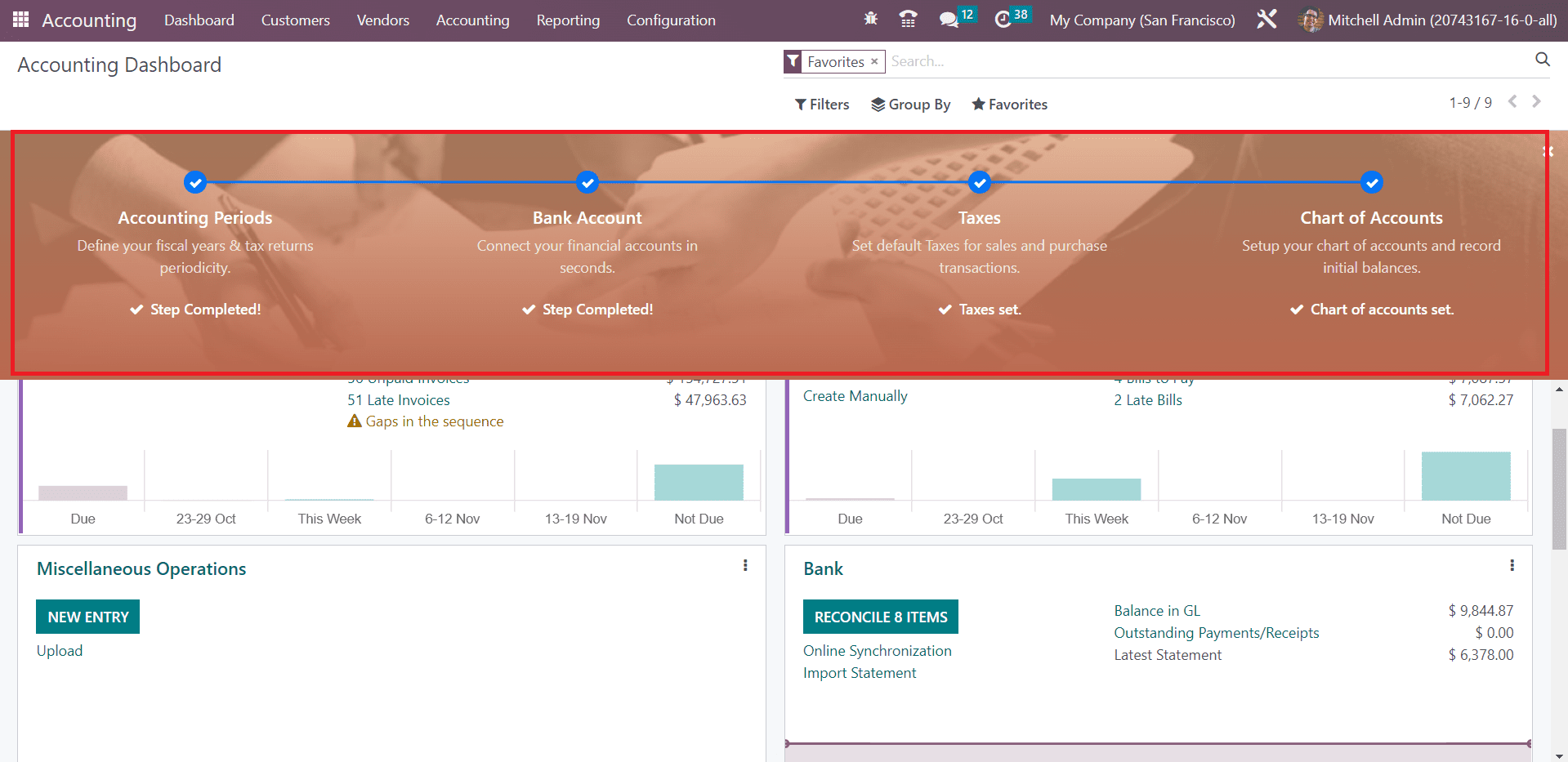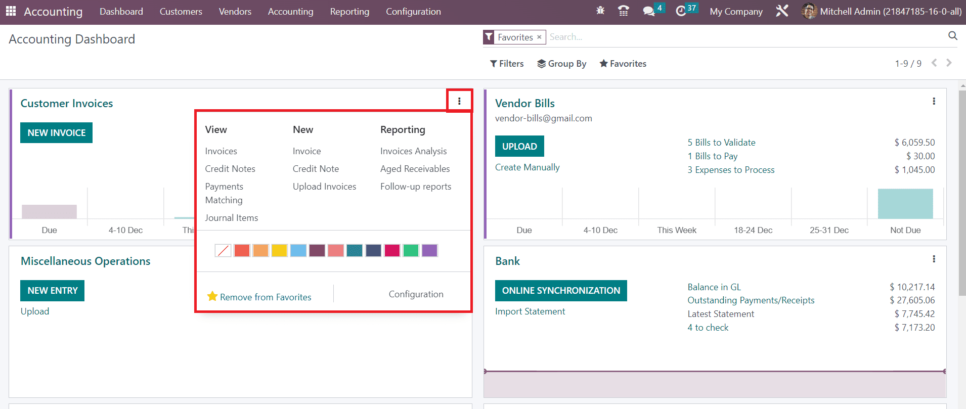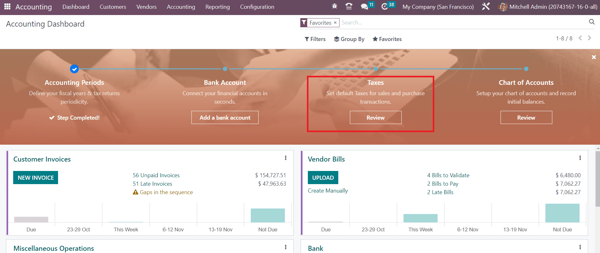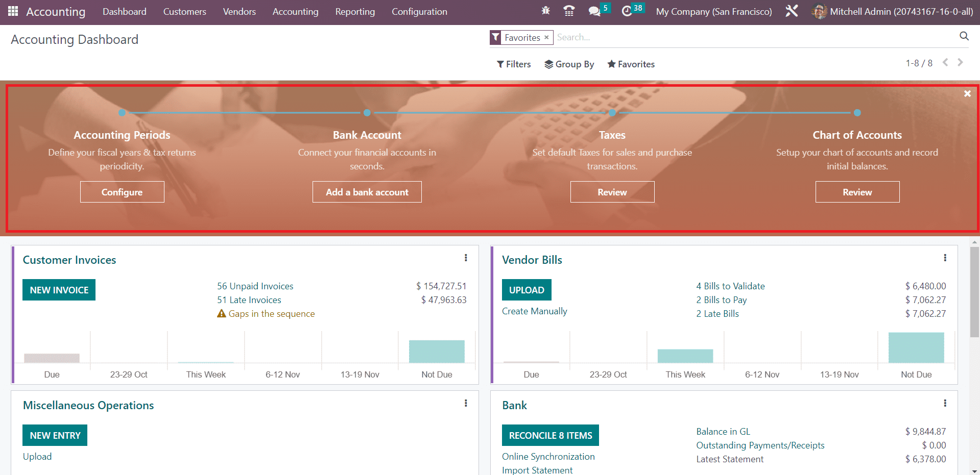The Accounting dashboard gives a preview of all major operations available in the module. You can manage Customer Invoices, Vendor Bills, Miscellaneous Operations, Bank, Cash, Point of Sale, Expenses, Exchange Difference, Cash Basis Taxes, Inventory Valuation, Salaries, and many more from the dashboard itself. Corresponding operation tools will be available for each accounting operation tab. You can use Favorites, Sales, Purchases, Liquidity, Miscellaneous, and Archived as default Filters. It is possible to use the customizable group by and filter options to organize data available in the accounting dashboard.