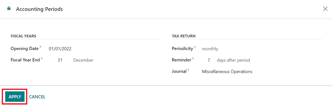 Initially, let's define the fiscal year and tax return periodicity in the Accounting Period section. Defining the accounting period is essential for any kind of accounting management operation. Click on the Configure button and Odoo will open a new pop-up window where you can mention the Fiscal Year and Tax Return period.