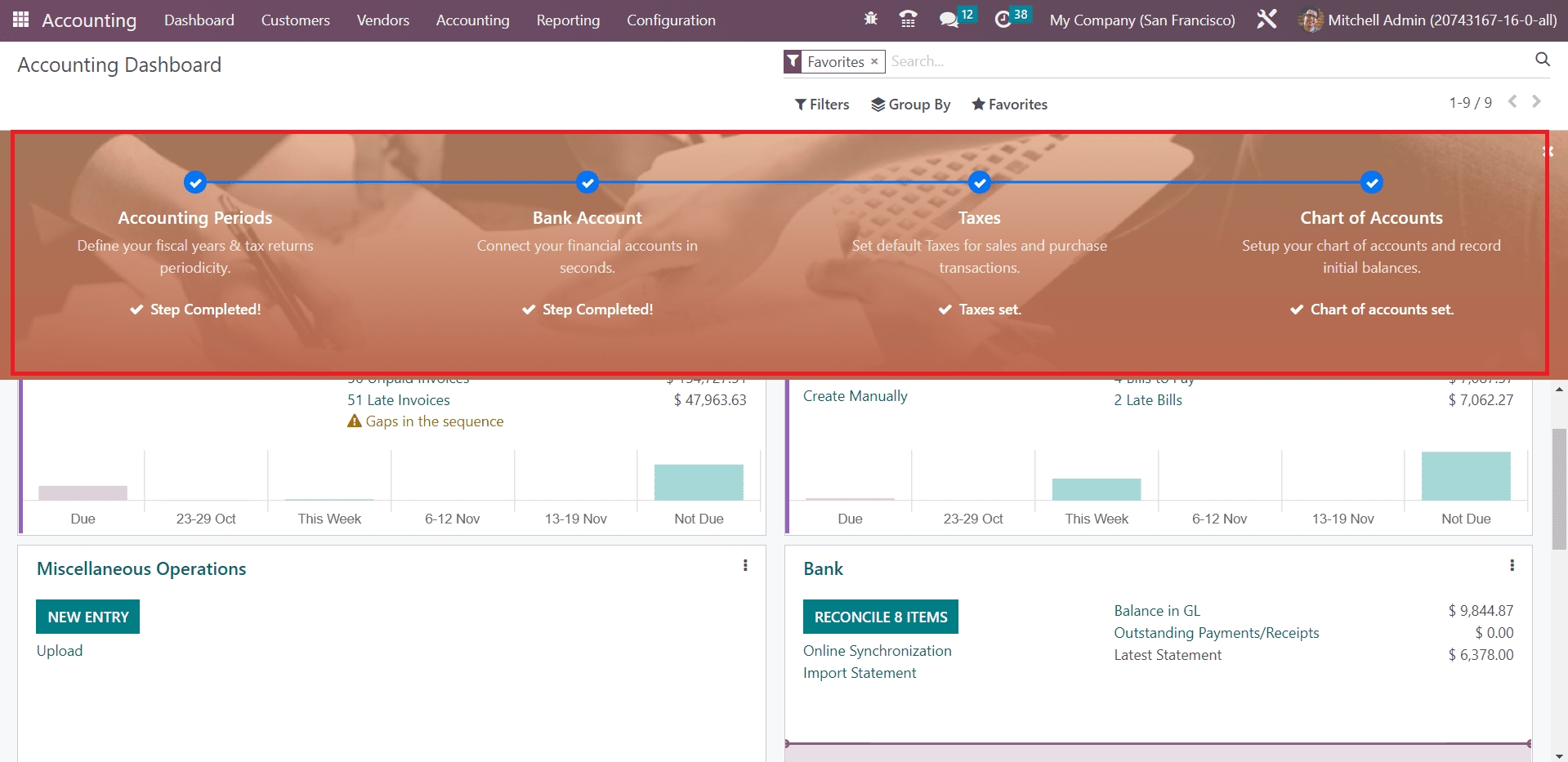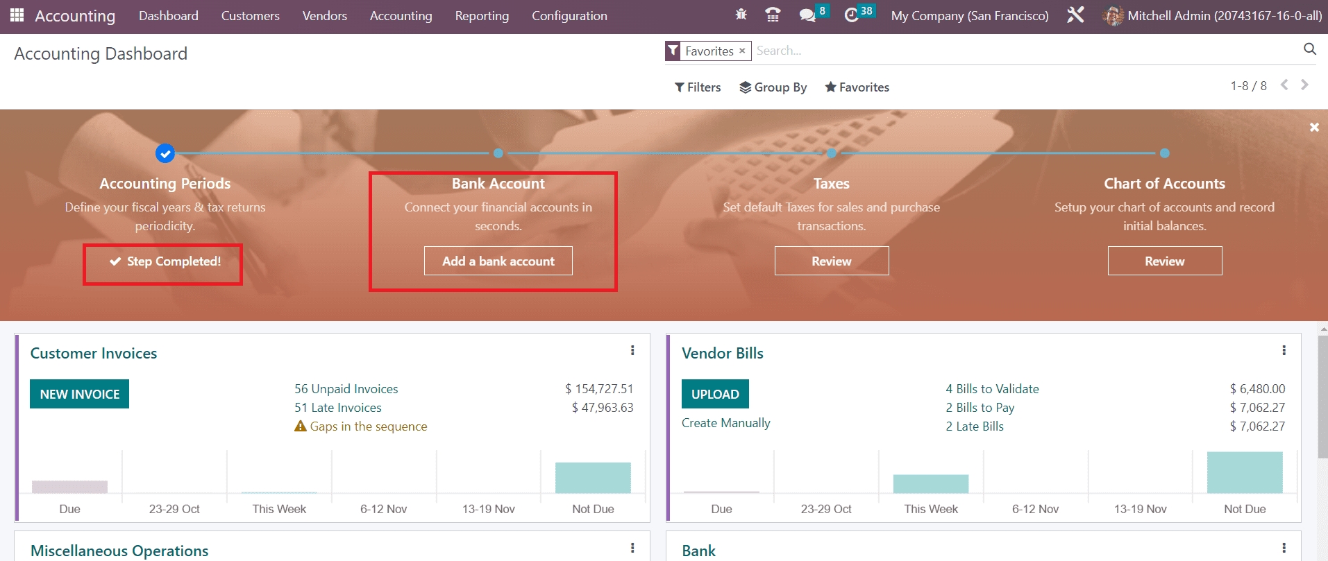 This is the image of the Accounting Dashboard of the module. Here, you will get a configuration panel where you can set Accounting Periods, Bank Accounts, Taxes, and Chart of Accounts step by step before starting any accounting operations.