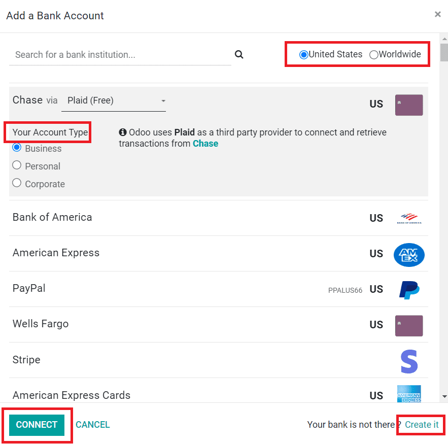 The screenshot given above shows the list of banks available in the United States region. You can use the filter Worldwide to get the list of banks available worldwide. After selecting the account, you can click the Connect button to connect with your account. If your bank is not available in the list, you can click the Create it button.