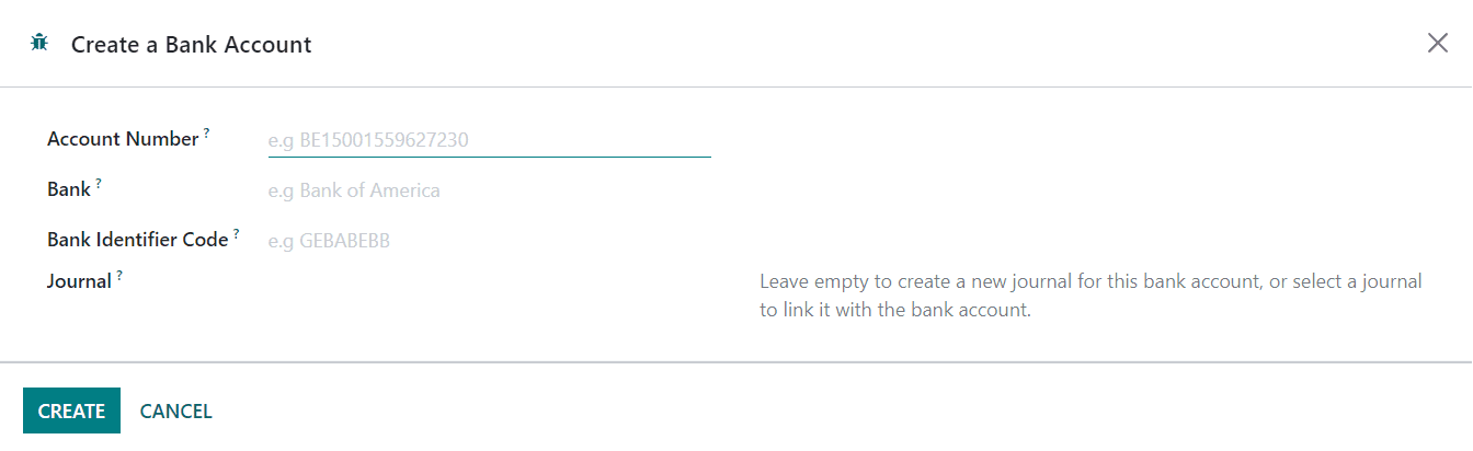 Here, you can specify your Bank Account Number, Bank, Bank Identifier Code, and Journal. Click the Create button and configure your account with the Odoo Accounting module. You can also add bank accounts to the Accounting module by using the Add a Bank Account option from the Configuration menu. To synchronize your bank account with the Odoo Accounting module, you can use the Online Synchronization button available in the same menu.