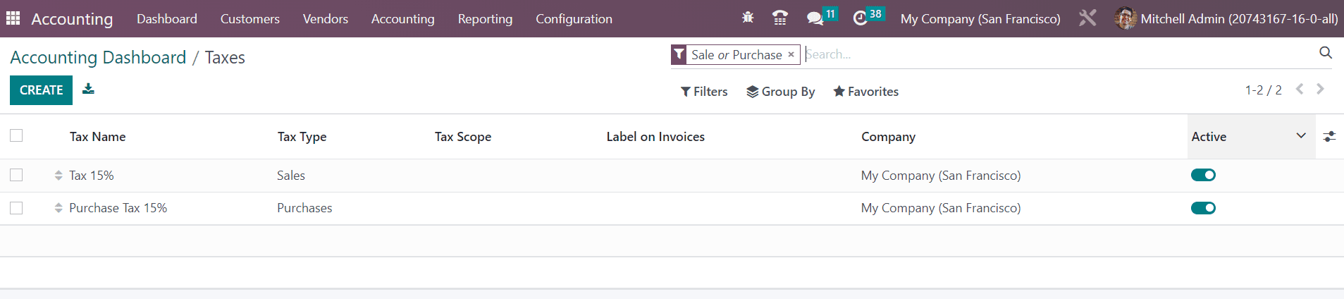 If you want to create a new tax for transactions, you can use the Create button. Using the Active button, you can activate the taxes and set them as default options for your sales and purchase operations.
