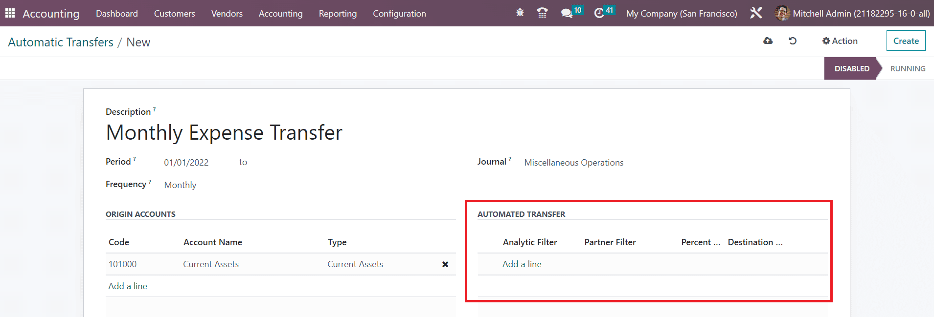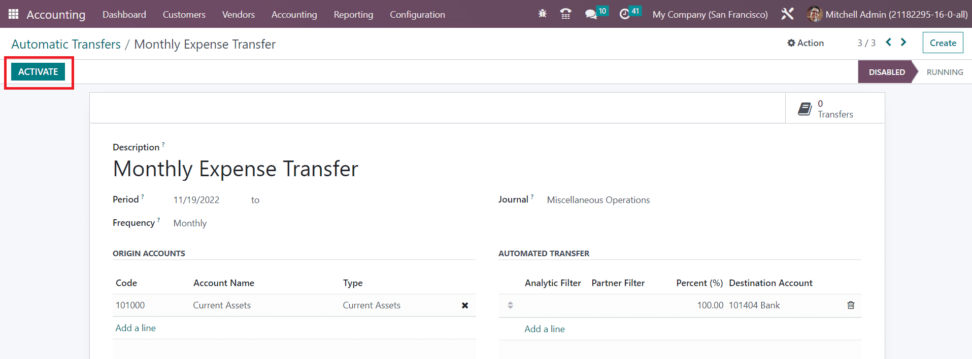 The Automatic Transfers feature in the Odoo Accounting module lets you plan scheduled transfers which will assist you to automate the bookkeeping operations. This feature can be used when you need to transfer an amount from one account to another over a fixed period of time. In order to get access to this feature, you can go to the Accounting menu.