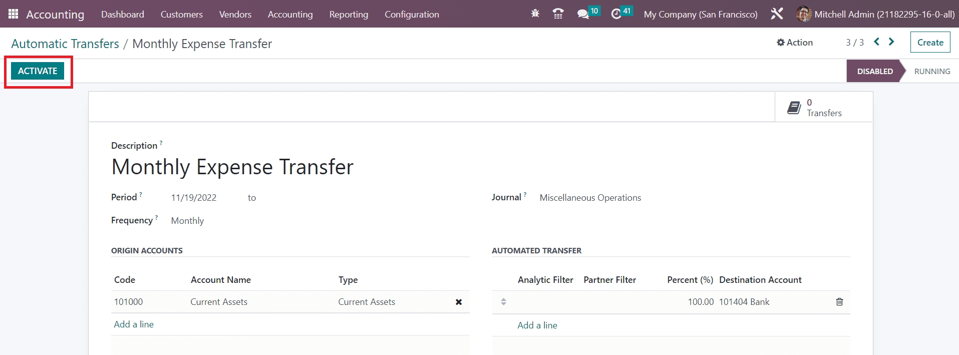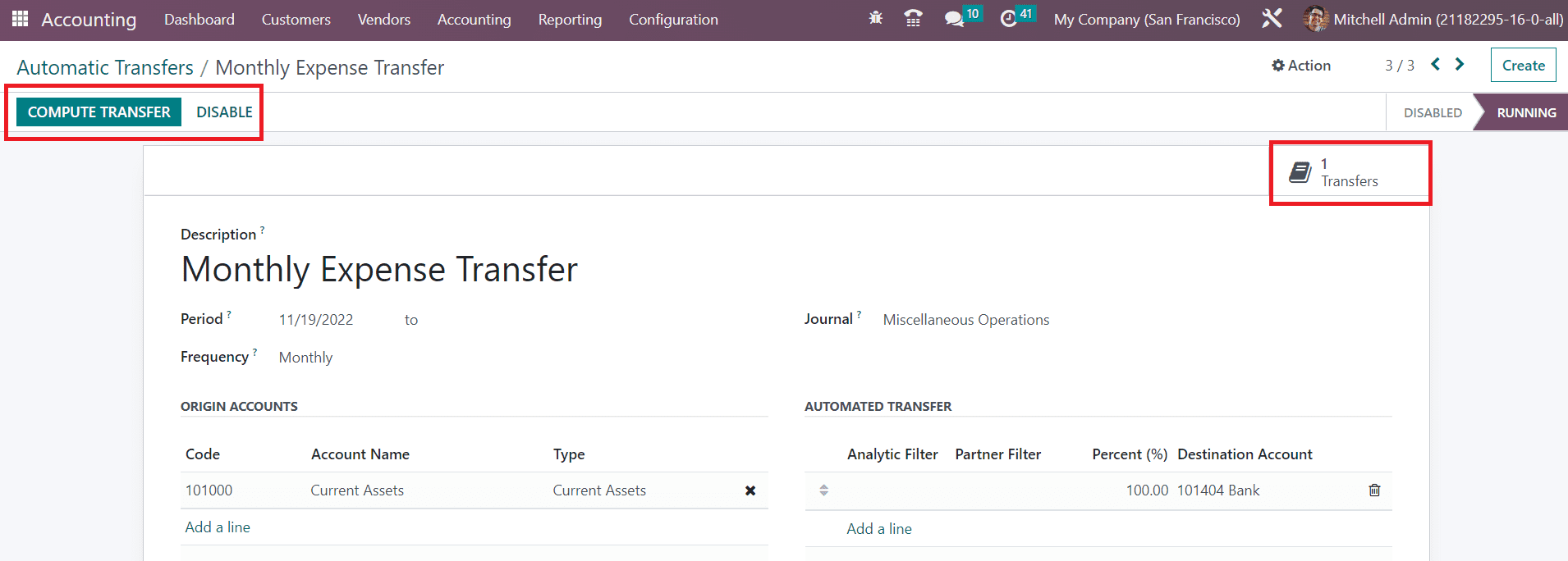 Once the transfer is activated, you can compute the transfer to the destination account using the Compute Transfer button. You can observe the transfers done using this scheduled plan in the Transfers smart button as highlighted in the screenshot below.