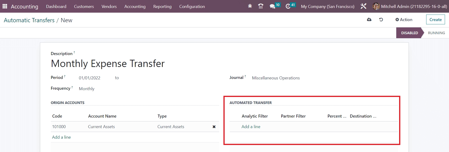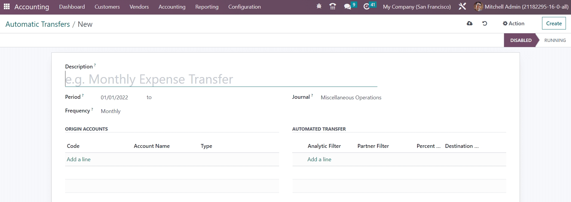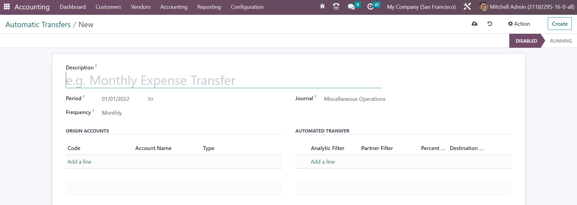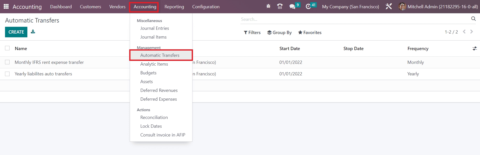 By clicking on the Accounting Transfers option, Odoo leads you to a new platform that shows the list view of the already scheduled automatic transfers. The preview gives the Name, Company, Start Date, Stop Date, and Frequency of each automatic transfer. Clicking on the Create button, you can schedule a new automatic transfer.
