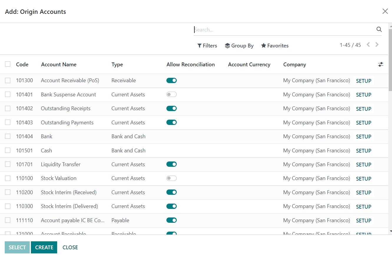 After selecting accounts, you can click the Select button and it will be added to the automatic transfers form view. You can observe the Code, Account Name, and Type of the source account under the Origin Accounts tab.