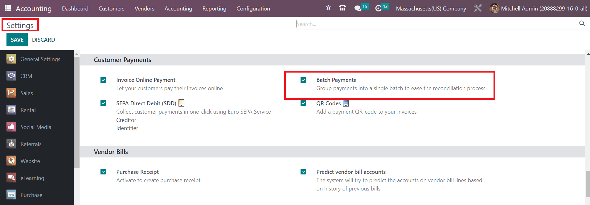 The batch payment feature in Odoo allows you to group different payments in order to simplify the reconciliation. Matching bank statements with batch payments is a crucial task in accounting management. Odoo provides support to reconcile multiple payments with bank statements in simple methods. With the assistance of the batch payment feature, you can process a group of payments in a single step. This will record the batch payment as a single entry in the bank statement. In order to get this feature in the Odoo Accounting module, you have to activate the Batch Payments option from the Settings menu as shown below.