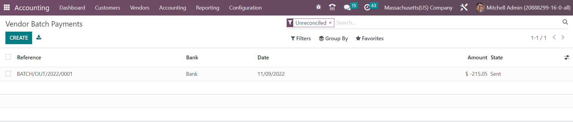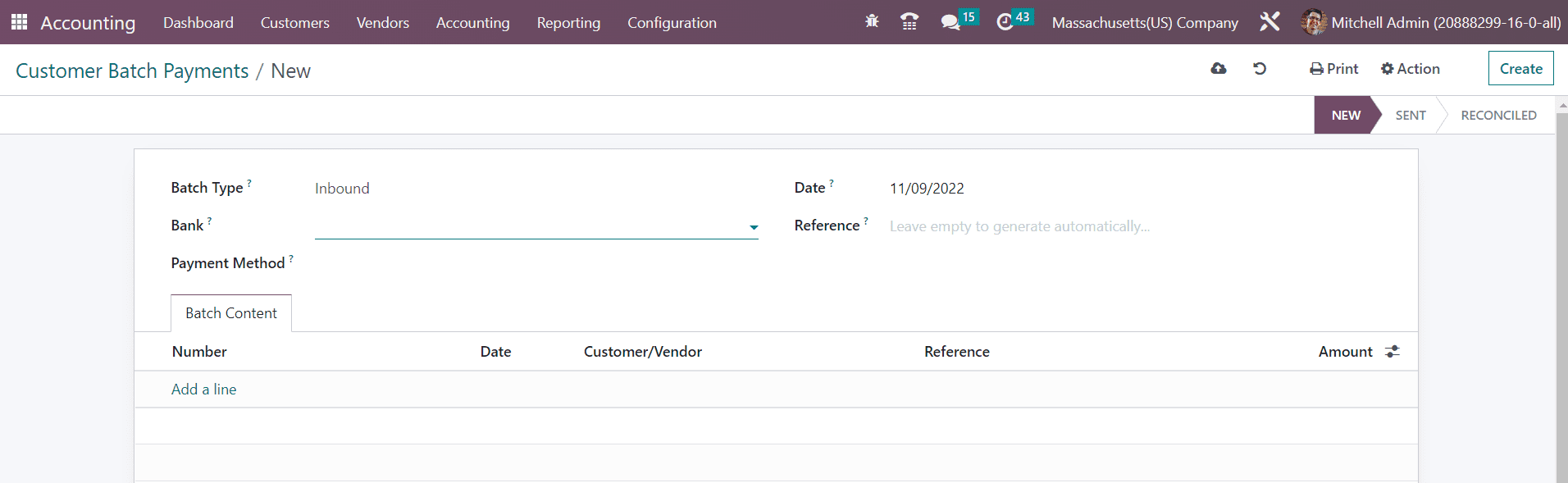 The list view of the Batch Payment window is shown above. Here, you can observe the Reference, Bank, Date, Amount, and State of the batch payments. Clicking on the Create button will lead you to a new window where you can configure a new batch payment.
