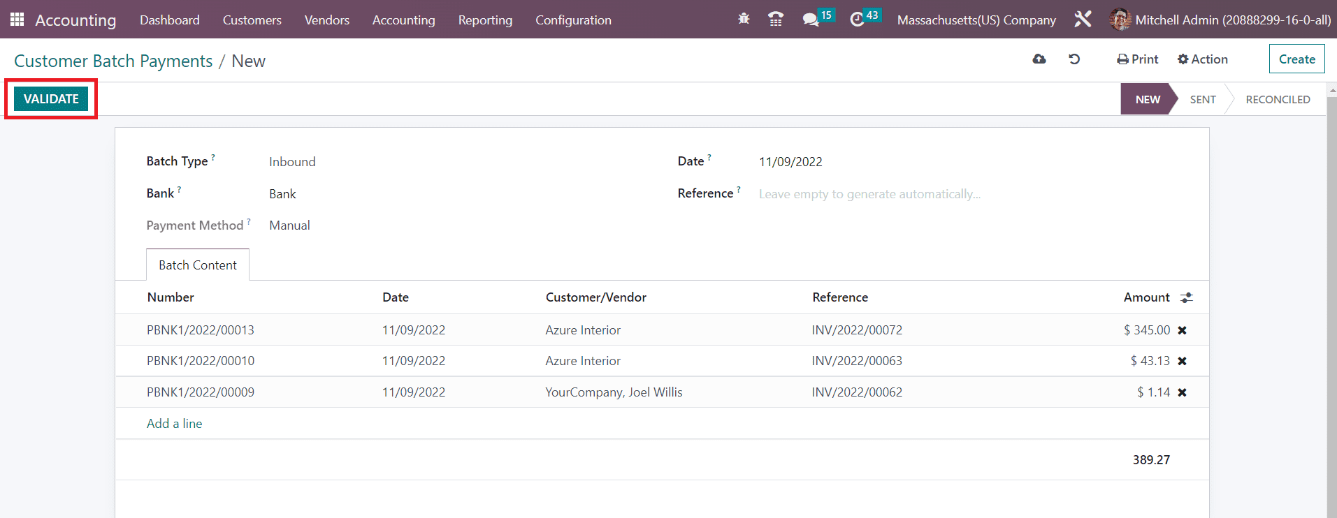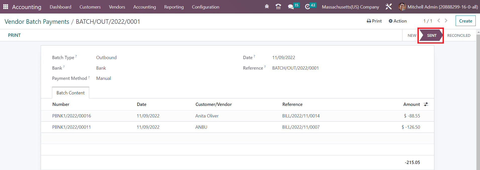 The stage of the validated batch payment can be seen as Sent as shown in the image above which indicates that the payment needs to be reconciled with the bank statement.
