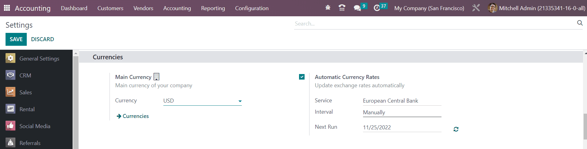In order to update the exchange rates automatically, you can activate the Automatic Currency Rates field. Here, you are requested to mention the Service, Interval, and Next Run details in the respective fields.