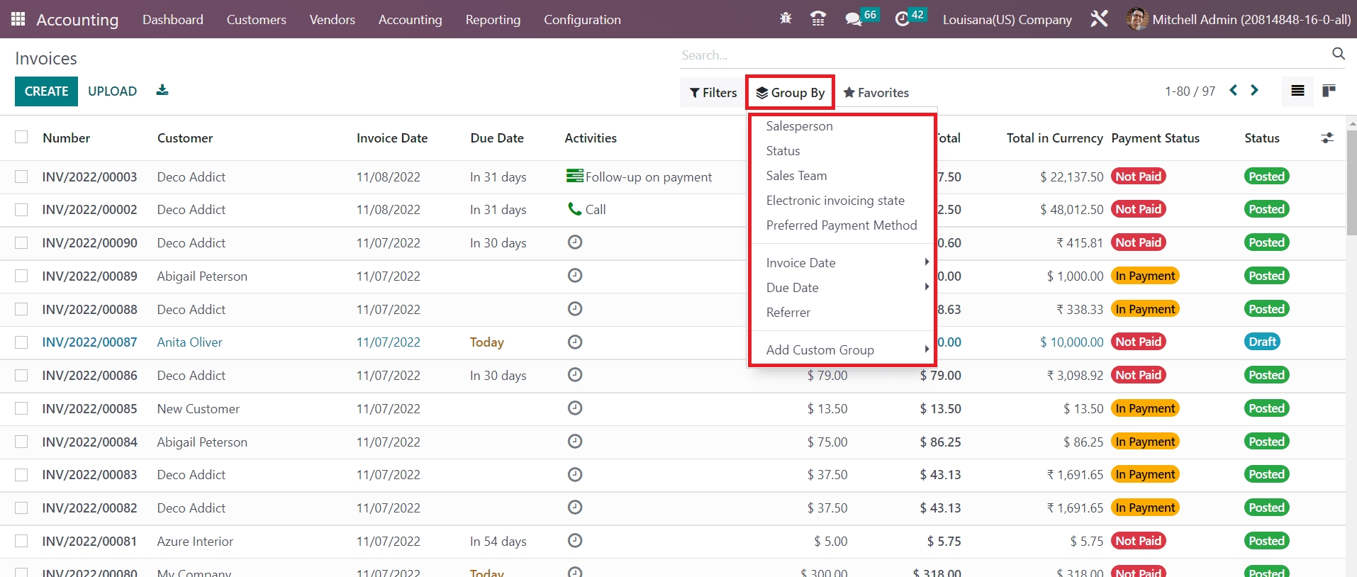 In the Group By option, you can group the available invoices according to the Salesperson, Status, Sales Team, Electronic Invoicing State, Preferred Payment Method, Invoice Date, Due Date, and Referrer. The Add Custom Group button helps you to create custom group options.
