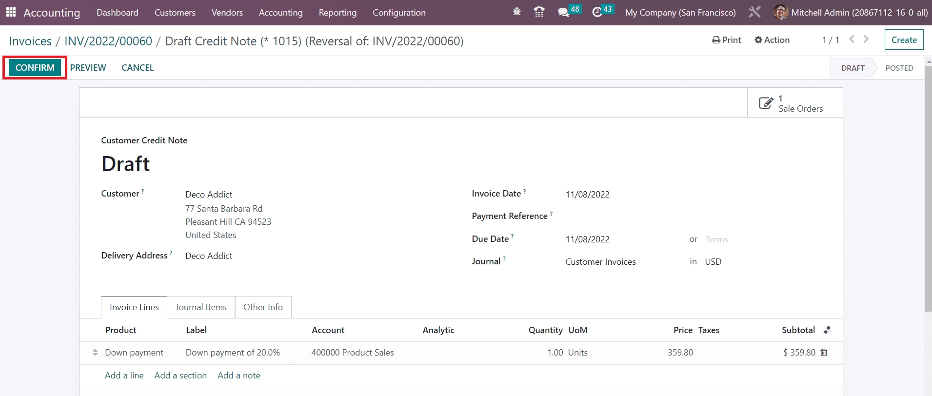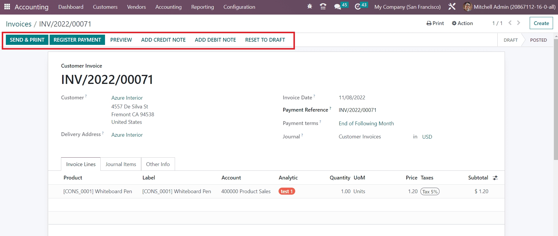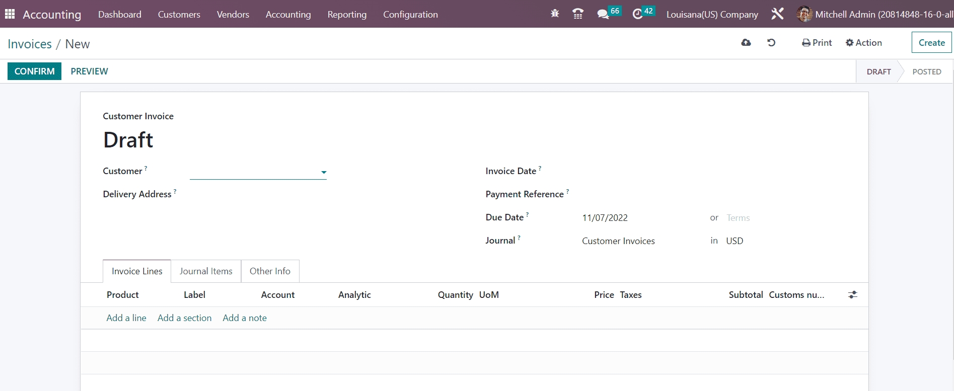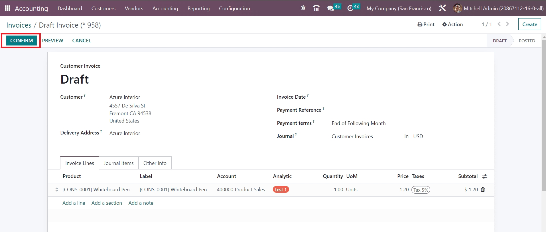 Now, the draft invoice is ready. In order to confirm this invoice, click on the Confirm button which will change the status of the invoice from Draft to Posted.