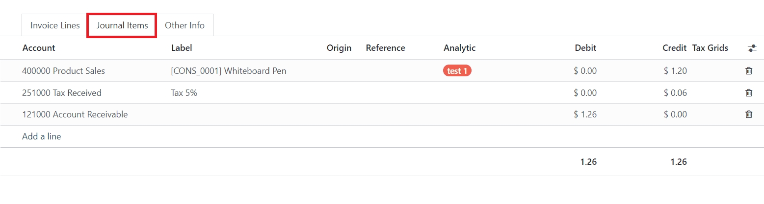 Based on the products you added in the invoice line, corresponding journal items can be seen in the Journal Items tab with the details of Account, Label, Origin, Reference, Analytic, Debit, Credit, and Tax Grids.
