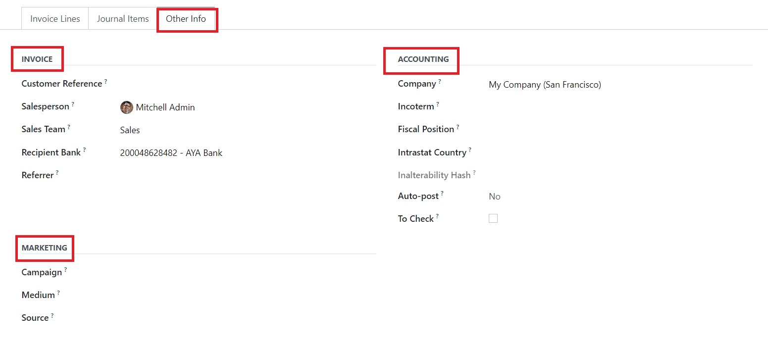 Use the Marketing field to specify the Campaign, Medium, and Source of this invoice. Your company id can be mentioned in the Company field available in the Accounting section. Specify the Incoterms used for international transactions, Fiscal Position to adapt taxes and accounts for particular customers or sales orders/invoices, Intrastat Country (Arrival Country), and Inalterability Hash in the respective fields. You can post this entry automatically by selecting the period from the Auto Post field. This recurring move will be posted up to a particular date and you can set that date in the Auto Post Until field. If you want to do it manually, you can select the No option from the Auto Post field.
