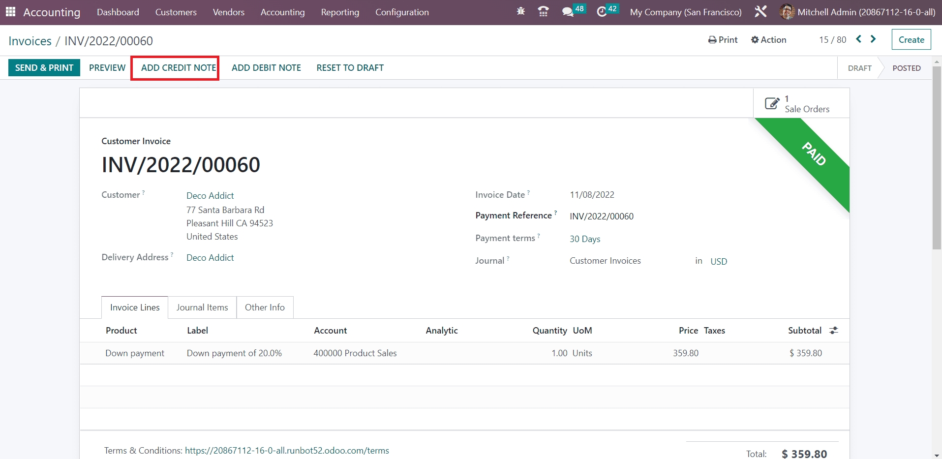 In the case of any mistakes in the invoice, wrong delivery of products, damaged goods, or rejection of service, you can trigger a credit note to your customer. This can be done by using the Add Credit Note button.