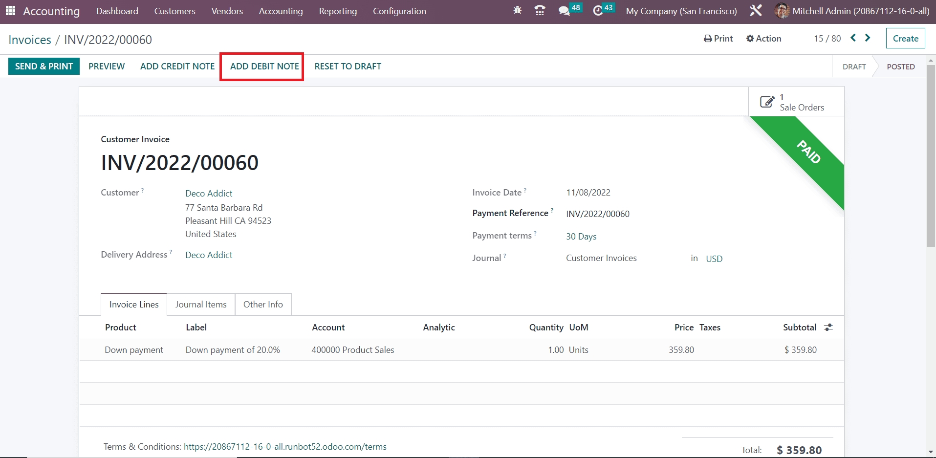 In Odoo, Debit Notes are used to generate bills or invoices. By generating the Debit Notes, Odoo will automatically reverse the respective bill and invoice.