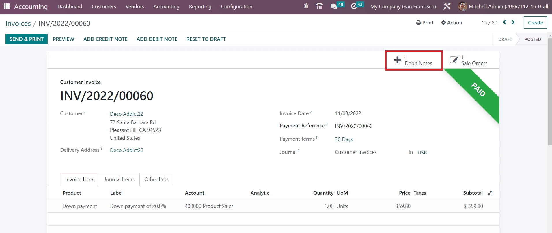 In the new wizard, define the Reason, Debit Note Date, Copy Lines, and Use Specific Journal to add the debit note. Click the Create Debit Note button. You can observe the debit notes generated on an invoice using the smart button available on the window.