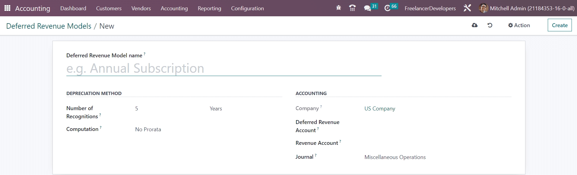 These models can be used while creating new deferred revenues in Odoo. Click the Create button to create a new module.