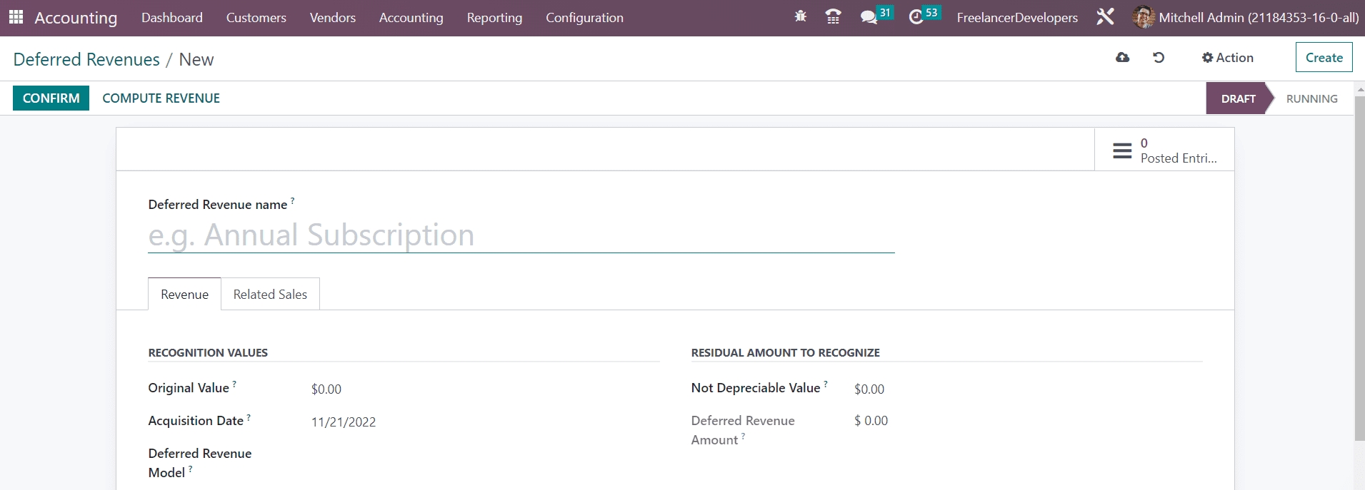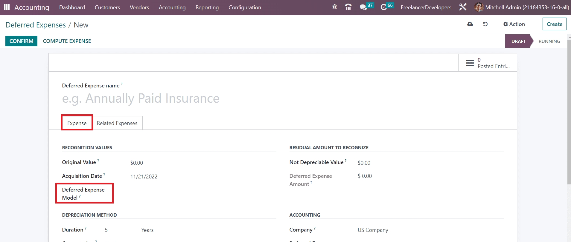 While configuring the model, you are requested to mention the Deferred Expense Account and Expense Account in the respective fields. Now using this model, you can create a record of new Deferred Expenses from the Accounting menu.