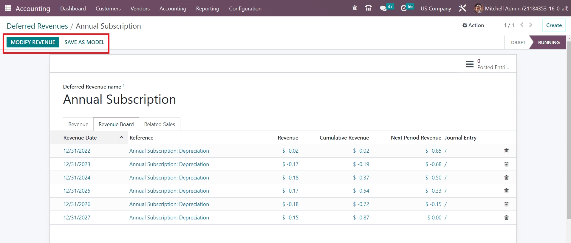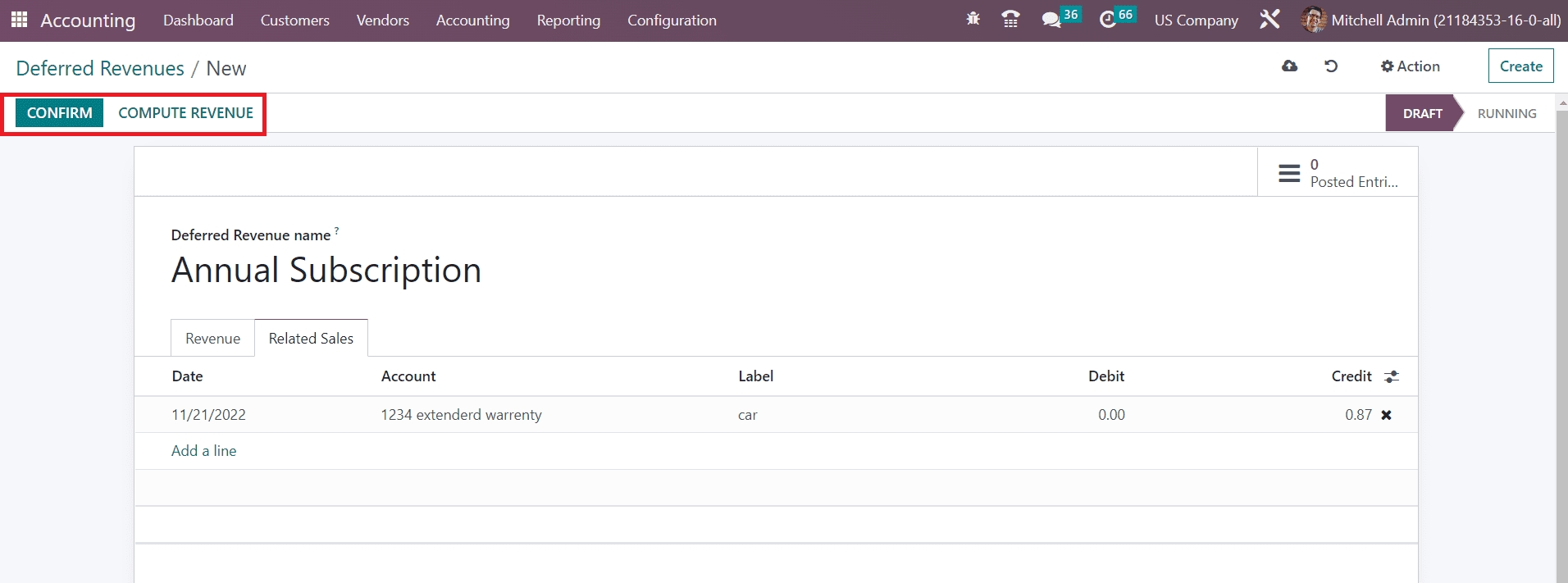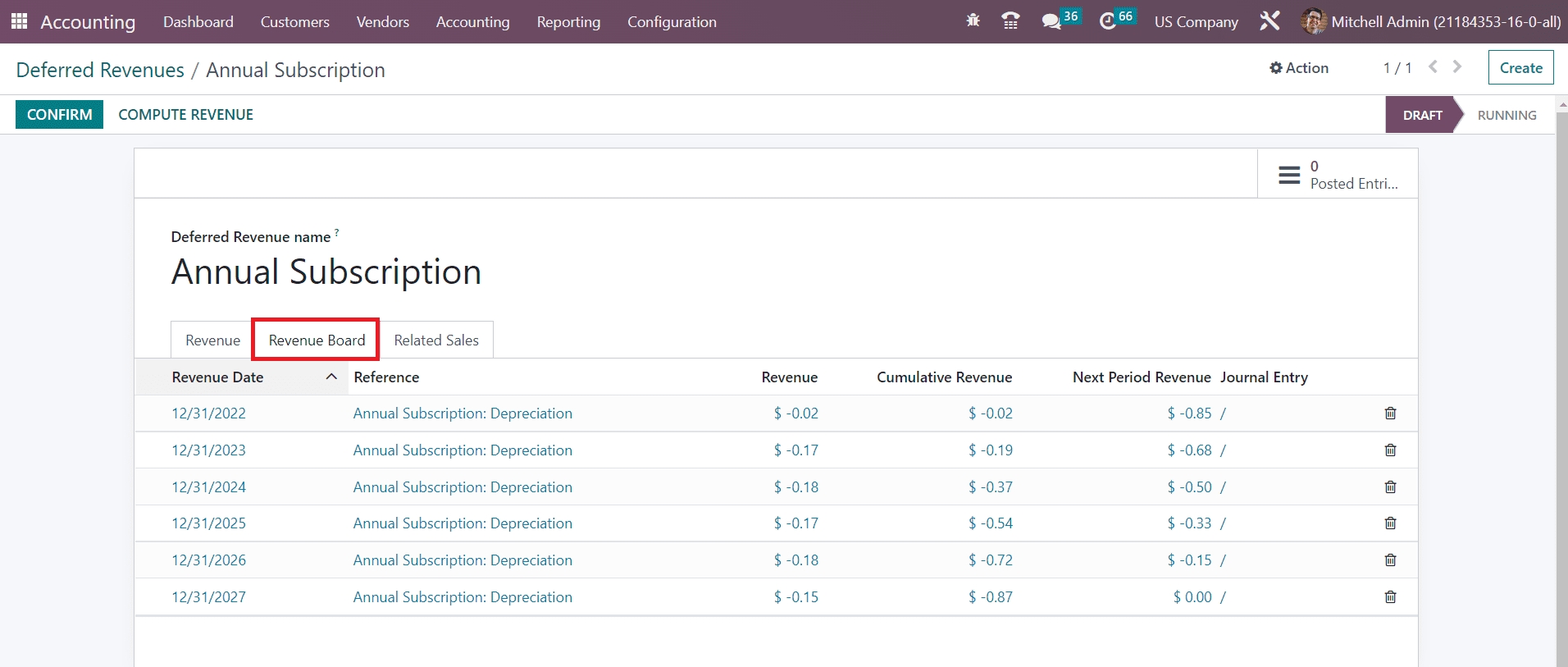This tab will show the details of the Revenue Date, Reference, Revenue, Cumulative Revenue, Next Period Revenue, and Journal Entry. Now, click on the Confirm button to confirm the new deferred revenue and change the status from ‘Draft’ to ‘Running’.