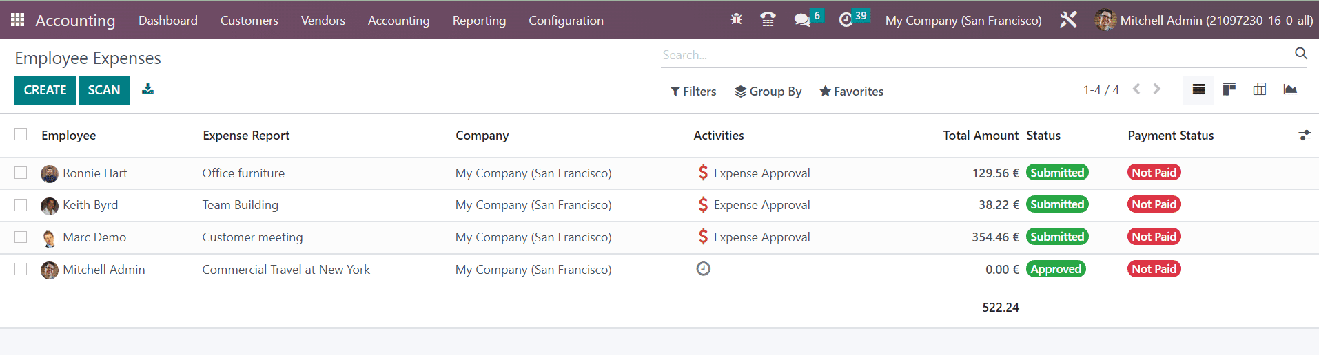 The Employee, Expense Report, Company, Activities, Total Amount, Status, and Payment Status can be seen in the list view of the Employee Expenses. The Scan option allows you to scan and upload expense reports. To create a new report, click the Create button.