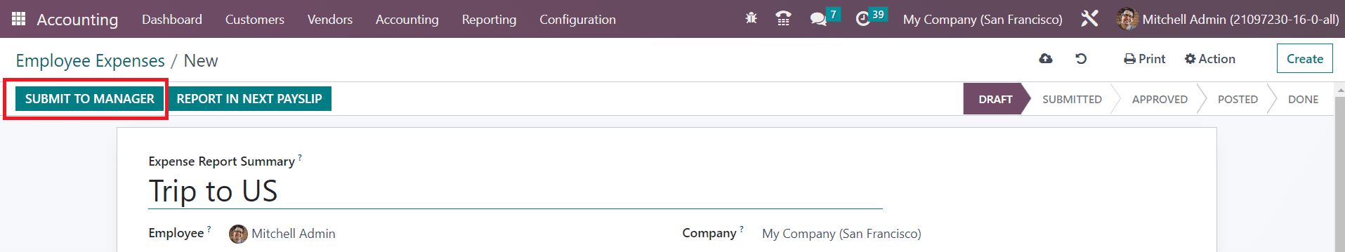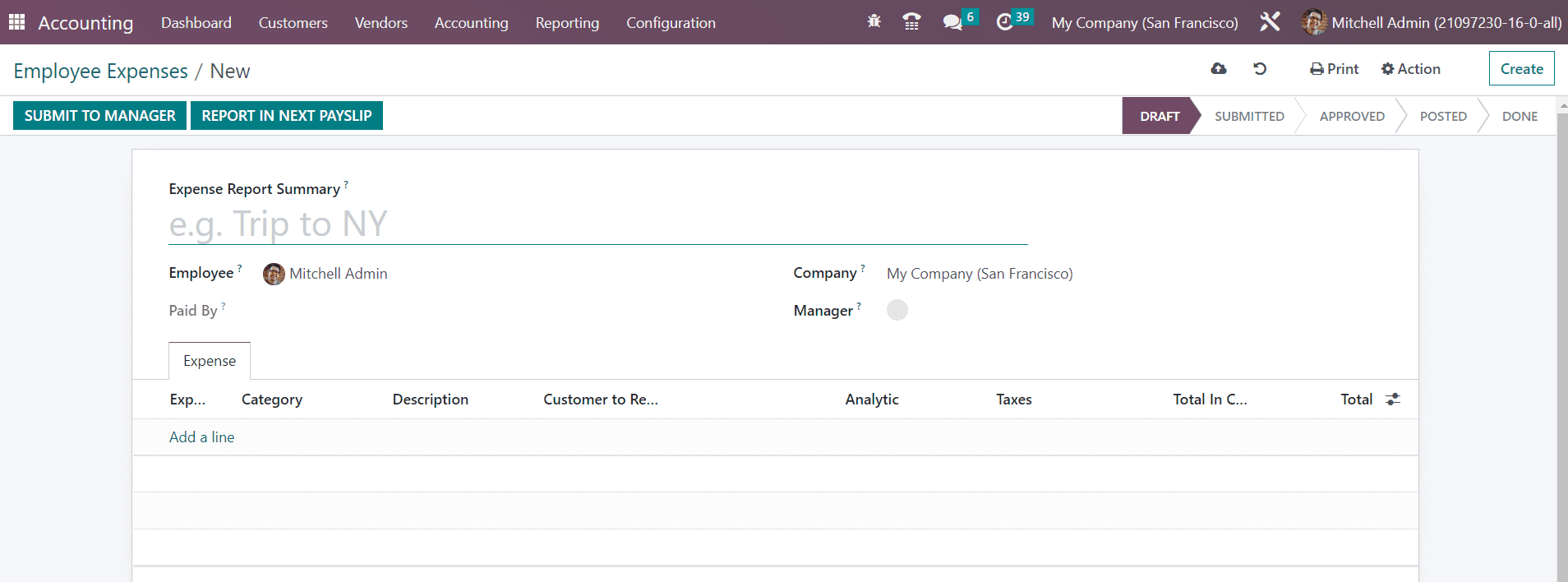 After adding the expense lines, you can click on the Submit To Manager button. Clicking on this button will submit the expense report to the mentioned manager for approval.