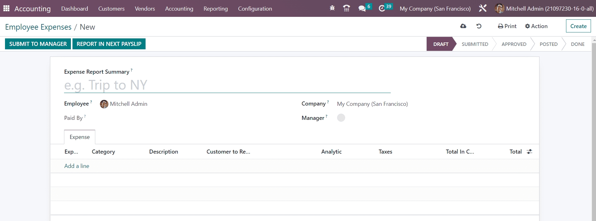 There may be situations where the employee has to spend money from their personal fund to perform a project or task or complete purchases on behalf of the company. In such cases, the company is responsible for returning the money to the respective employee. An employee can record these expenses with the assistance of the Odoo Accounting module. The Employee Expenses option can be seen under the Vendors menu. Here, you can record your expenses and submit them to the manager for approval. Once you get approval from the manager, the amount mentioned in the Expense will be returned to your account.