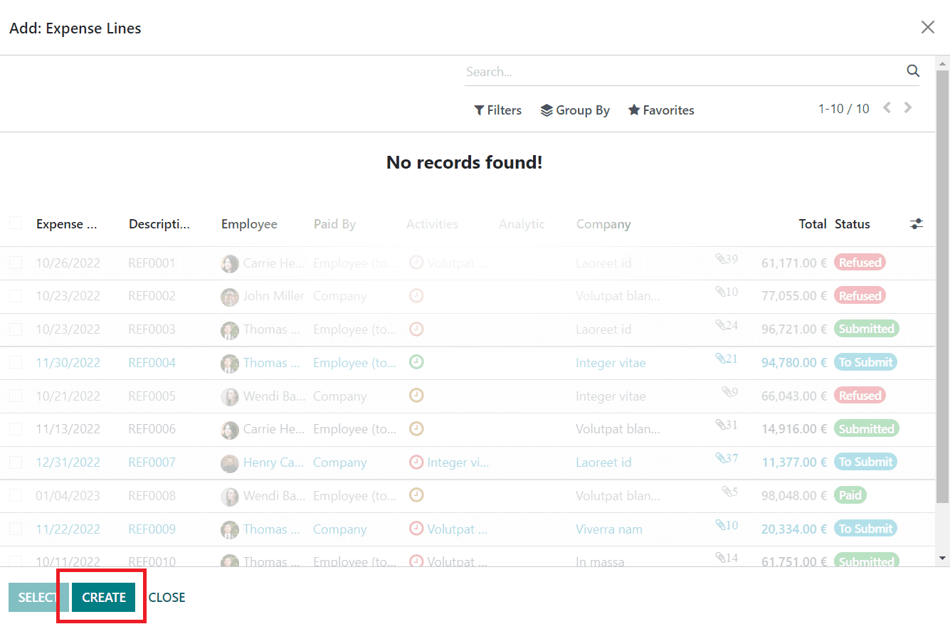 If you haven’t recorded your expenses yet, you can click on the Create button to create a new expense line.