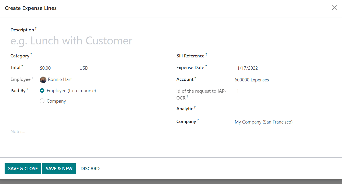 Add a Description for the expense line and specify the Category of the expense. In the Total field, you can mention the total expense in the selected currency. In the respective fields, you can define data related to Employee, Paid By, Bill Reference, Expense Date, Account, Analytic, and Company.