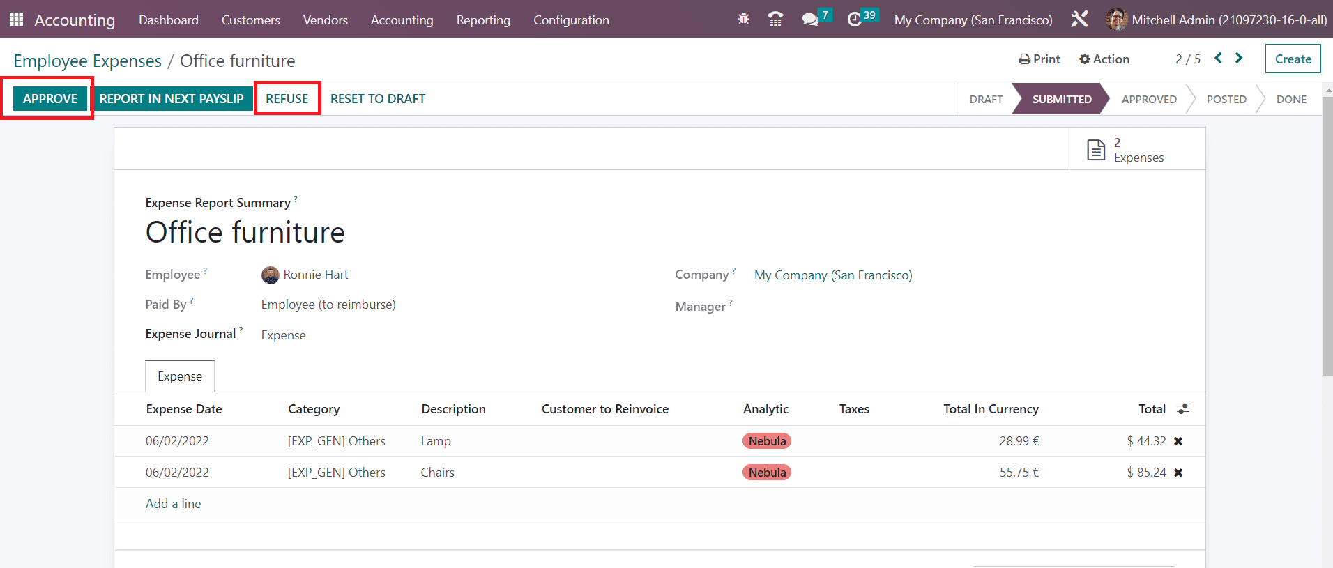 The manager can reset the expense report to draft if it requires clarifications. If any obligations are found in the report, the manager can refuse the expense using the Refuse button. The approved expense will be added to your next payslip.
