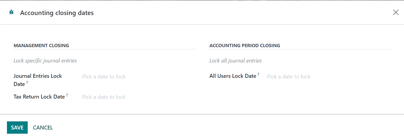 Under the Management Closing tab, you can lock specific journal entries by mentioning the Journal Entries Lock Date in the respective field. By doing so, Odoo will prevent journal entries creation prior to the defined date except for account users. You can pick a date to lock in the Tax Return Lock Date to prevent Tax Returns modifications prior to the defined date (journal entries involving taxes). The Tax Return Lock Date is automatically set when the corresponding journal entry is posted. It is possible to lock all journal entries from the Accounting Period Closing tab. Pick a date in the All Users Lock Date field that will prevent journal entry creation or modification prior to the defined date for all users. As a closed period, all accounting operations are prohibited once you set a lock date.