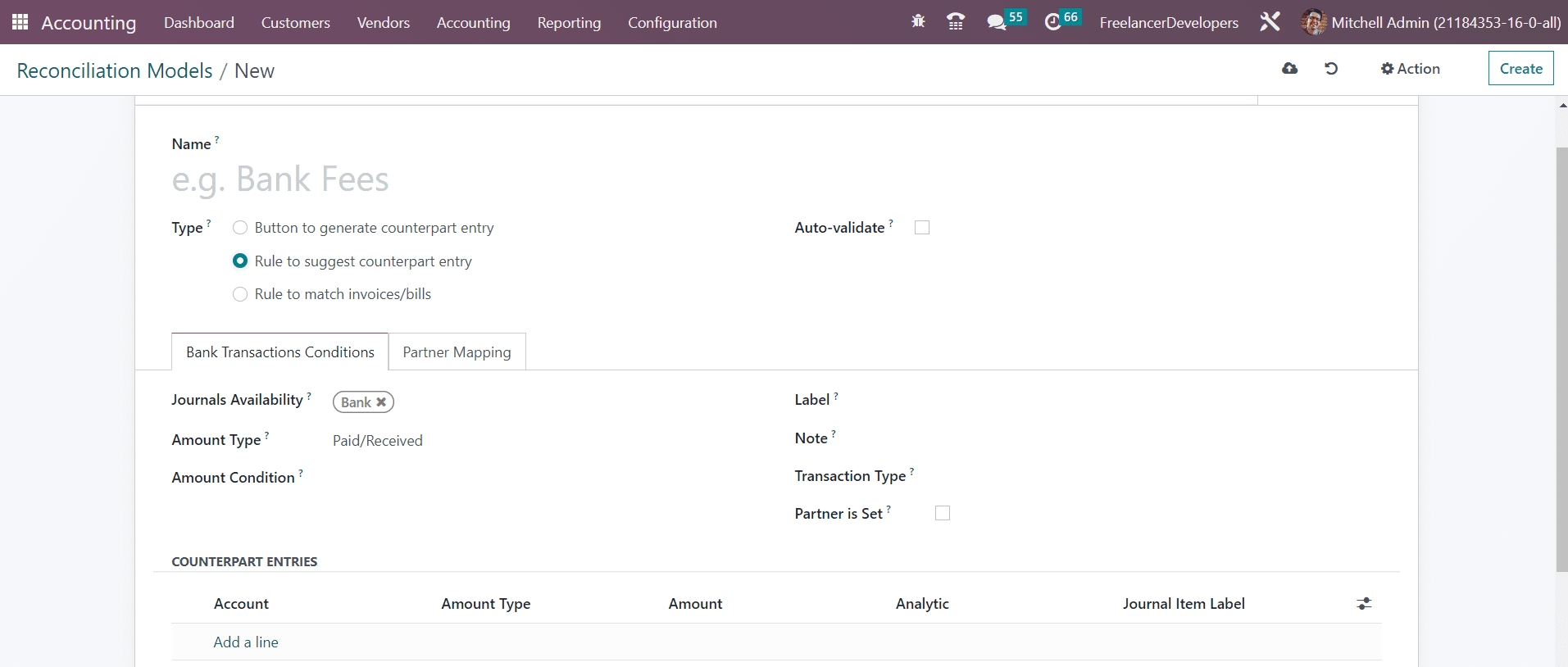 Here, you will get the Auto-Validate option to activate to validate the statement line automatically. After mentioning the Journal Availability, you can select a suitable Amount Type from the given options which are Received (only applied when receiving an amount), Paid (only applied when paying an amount), or Paid/Received (applied in both cases). By doing so, the reconciliation model will be only applied to the selected transaction type. In the Amount Condition, you can mention a specific amount and the reconciliation model will be applied when the amount is lower than, greater than, or between the specified amount. You can set rules for Label, Note, and Transaction Type as Contains, Not Contains, or Match Regex. By activating the Partner is Set field, the reconciliation model will be applied only when a customer/vendor is set. By activating this option, you will be able to get additional fields to mention the Matching Partners and Matching Categories. Add Counterpart Entries in the given space using the Add a Line button.
