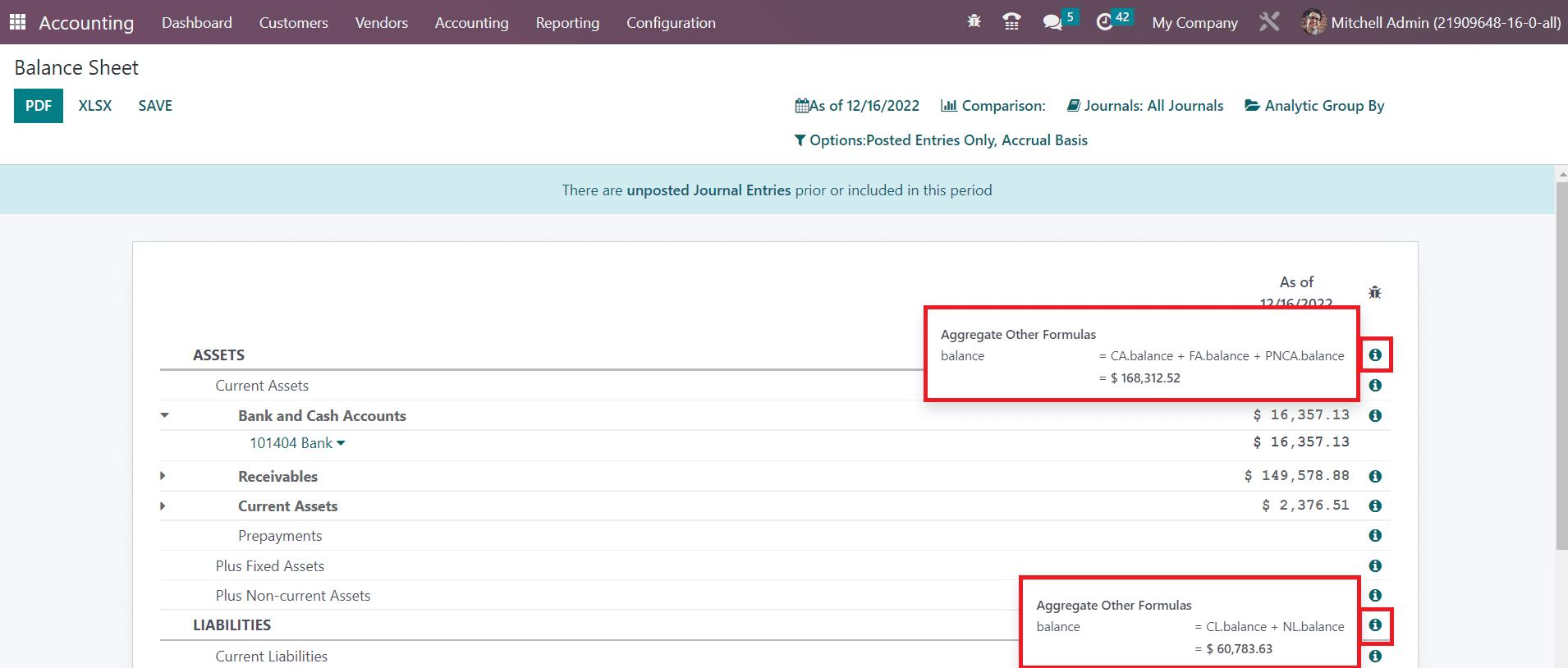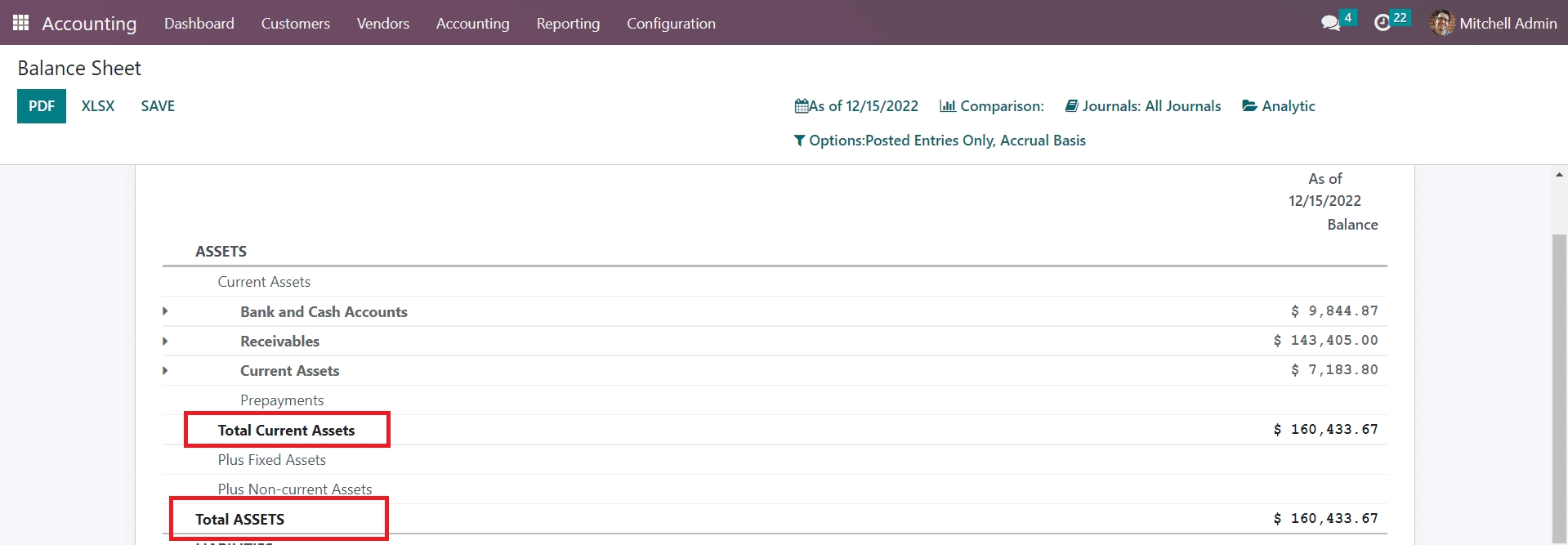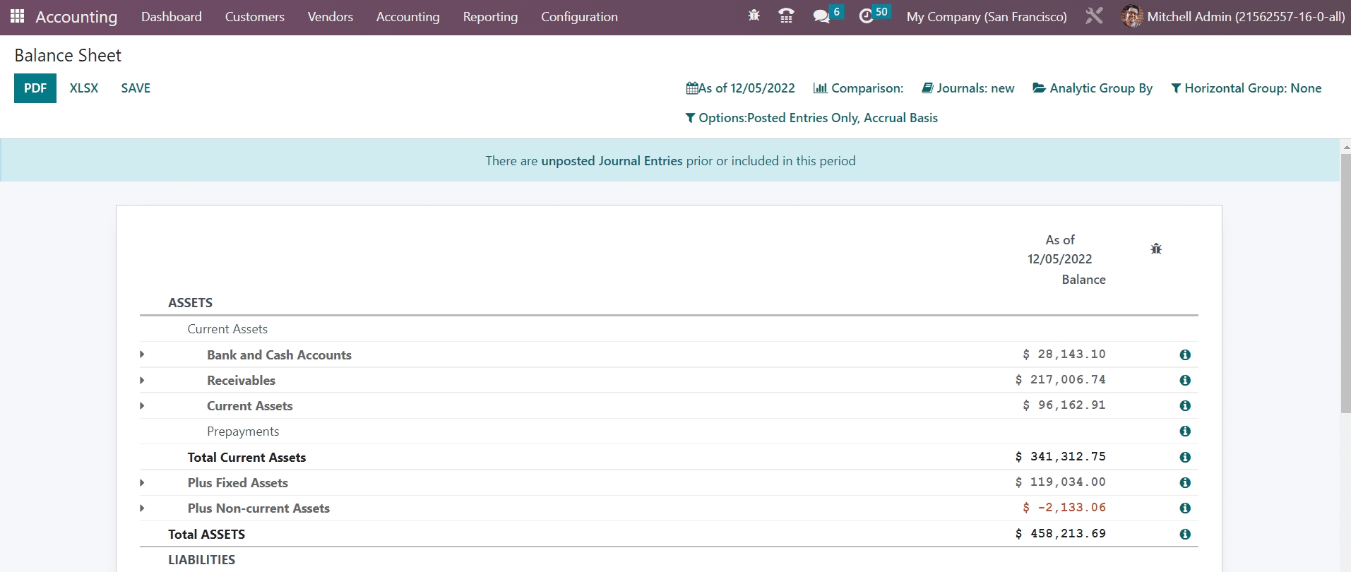 The reports can be compared with the previous period using the Comparison tool. If you want to get the balance sheet report of a particular journal, you can select that journal from the Journals option. Additionally, you will get some advanced filters also in order to sort the available data according to the requirements.