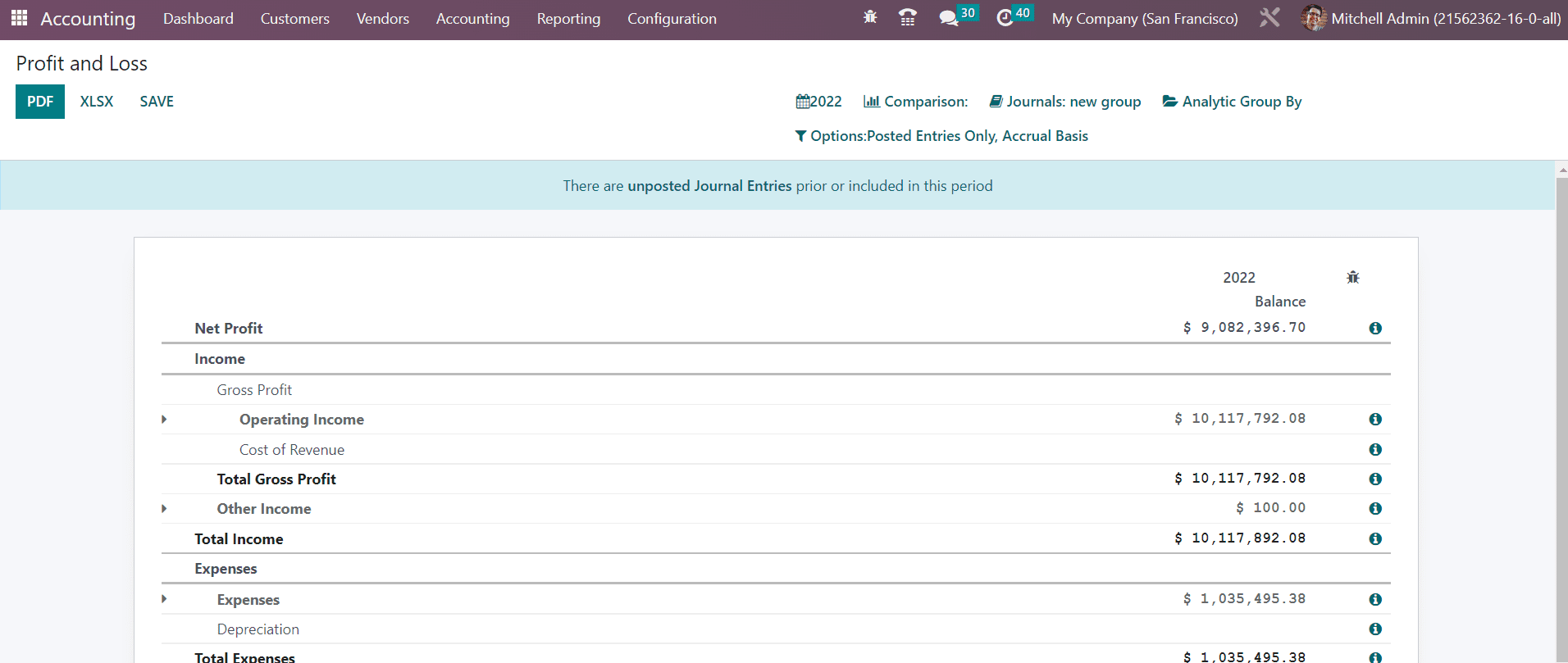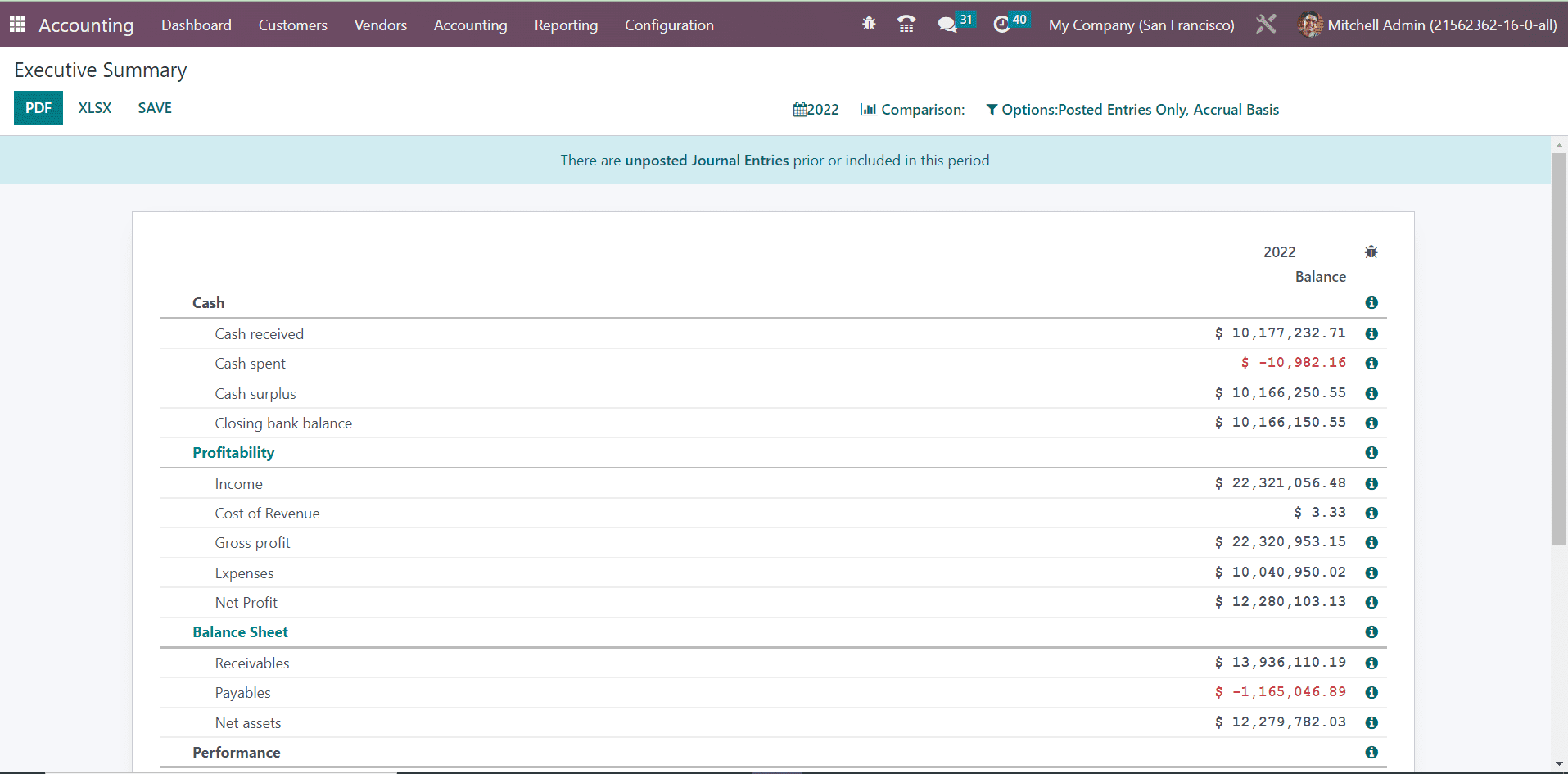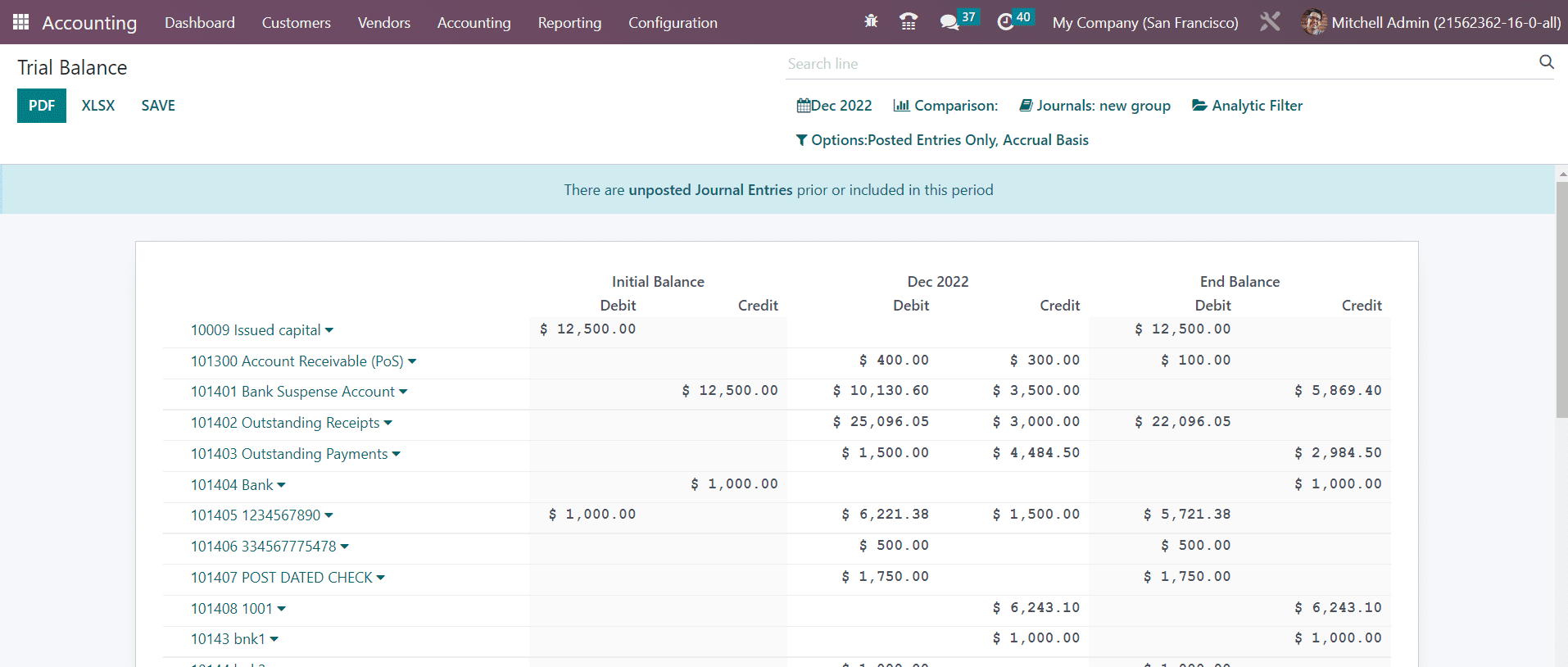 The reports can be compared with the previous period using the Comparison tool. If you want to get the balance sheet report of a particular journal, you can select that journal from the Journals option. Additionally, you will get some advanced filters also in order to sort the available data according to the requirements.