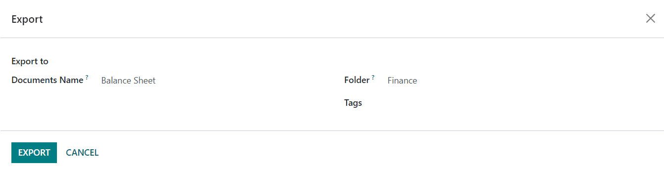 Using the PDF and XLSX options, you can convert the data into corresponding formats. In the Odoo Reporting platform, you will get a Save button to export the PDF or XLSX of the document to the Document module in Odoo. When you click on the Save button, a pop-up window will appear as shown below.