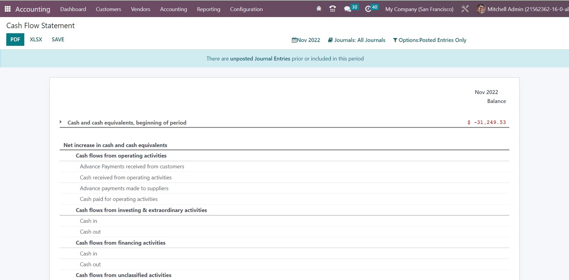 The cash flow statement reporting will provide the financial statement regarding all cash inflows and outflows. These reports will be based on the accounts you configured for the cash flow statement invoice. You will get the cash flow statement reports based on the operating activities, investment activities, and financial activities.