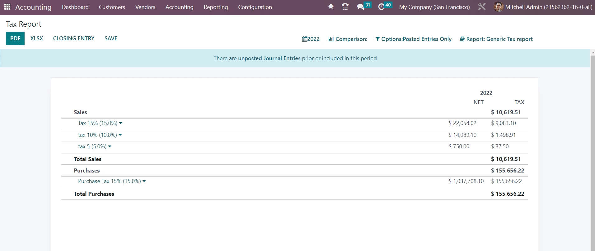 The detailed reports of sales and purchase taxes can be generated from the Tax Reports platform available in the Reporting menu. Using the Closing Entry option, you can report the return tax of the selected period.