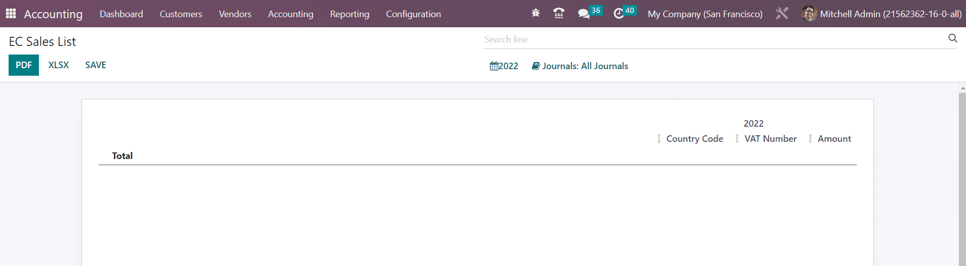 The report gives the total, country code, VAT number, and amount related to the EC Sales.