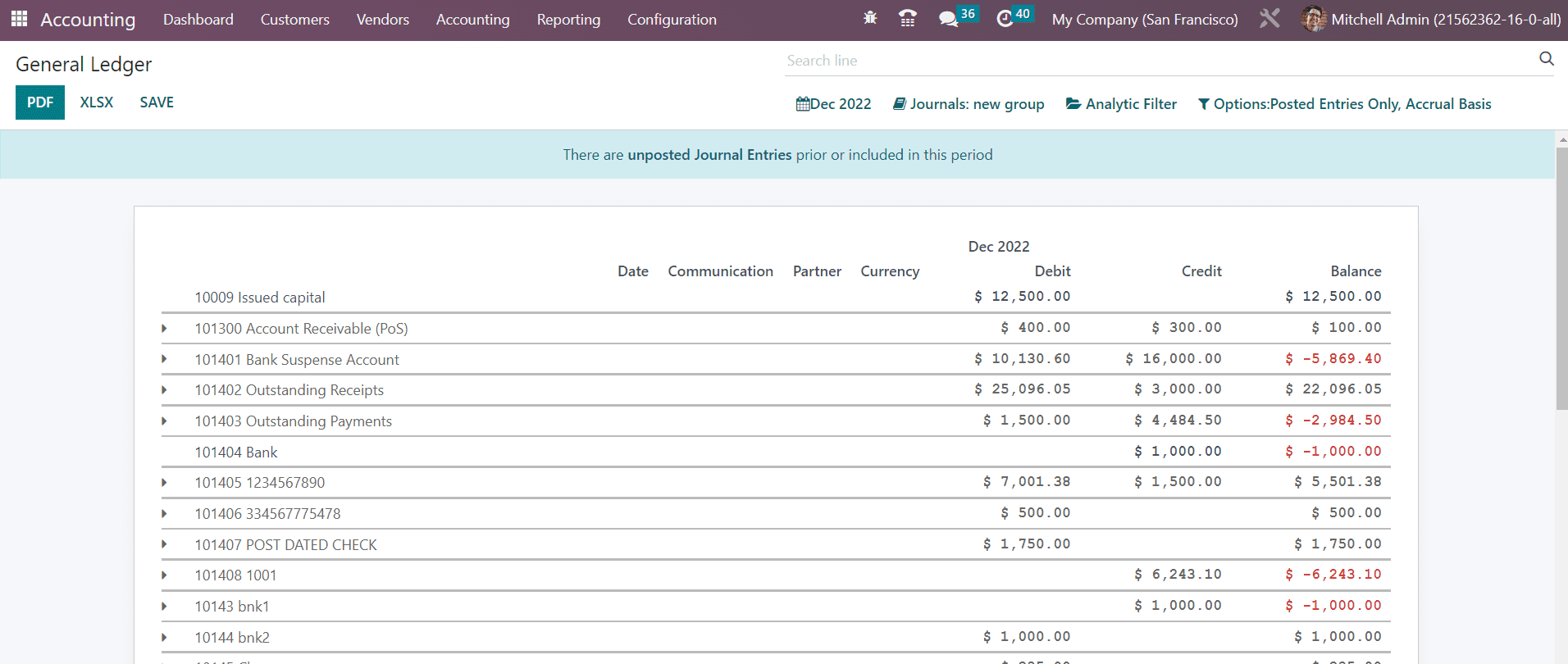 The General Ledger reports will show all transaction reports from all accounts configured in your system for a selected period of time. Along with the account name, you can observe the Date, Communication, Partner, Currency, Debit, Credit, and Balance of each account. It records every financial transaction of your organization during a financial year.