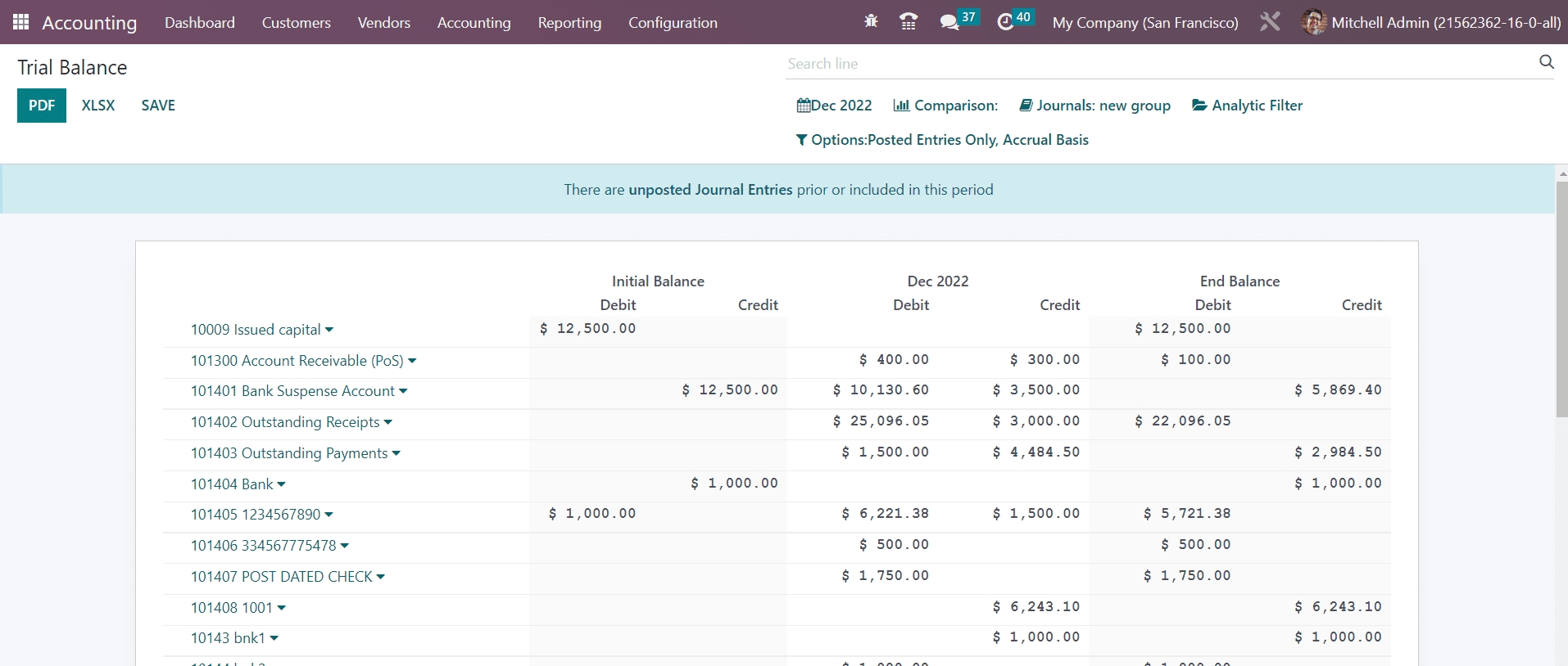 Trial balance is an accounting report that shows the results of all accounting entries posted through different journals. The trial balance reports are mostly generated on the financial year end of the organization. These reports are used for the operations of auditing. As you can see in the image below, the report shows the credit and debit details from initial balance, selected month/year, and end balance of the journal entries.