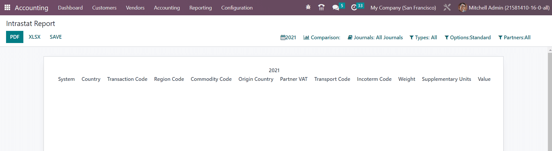 Intrastat is the system used to collect the statistics of transactions and trade of goods and services with EU member states. From the Settings menu of the Accounting module, you can activate this feature. The Intrastat Code option available in the Reporting menu will give reports of this, as shown below.