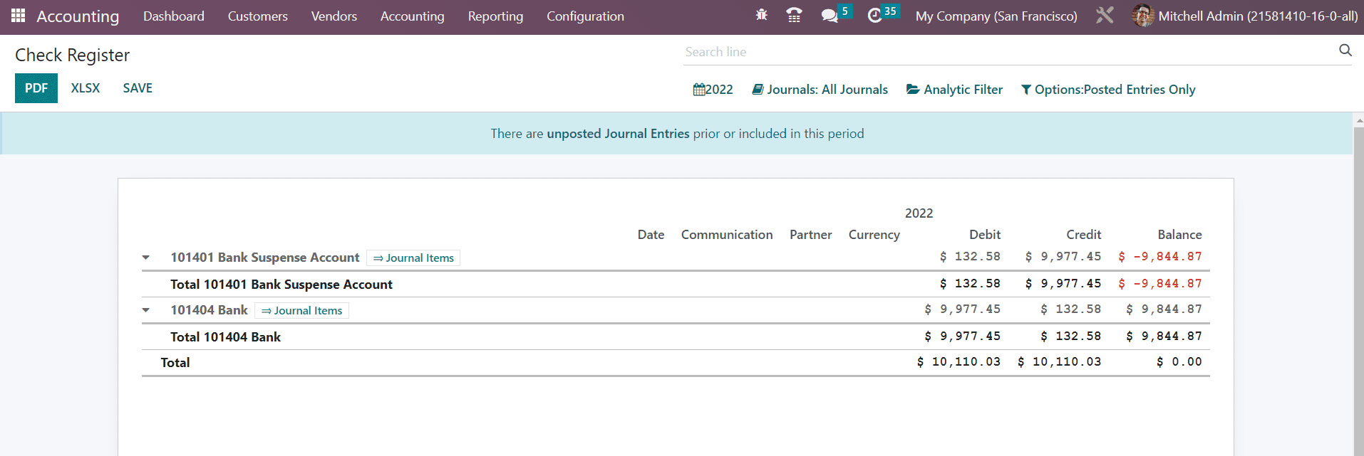 All financial transactions using checks will be reported in the Check Register platform in the Reporting menu. You can generate check register reports on this platform by selecting a particular period of time. The bank accounts used for check transactions, along with respective journal items, can be seen in this report. It shows the Date, Communication, Partner, Currency, Debit, Credit, and Balance details.
