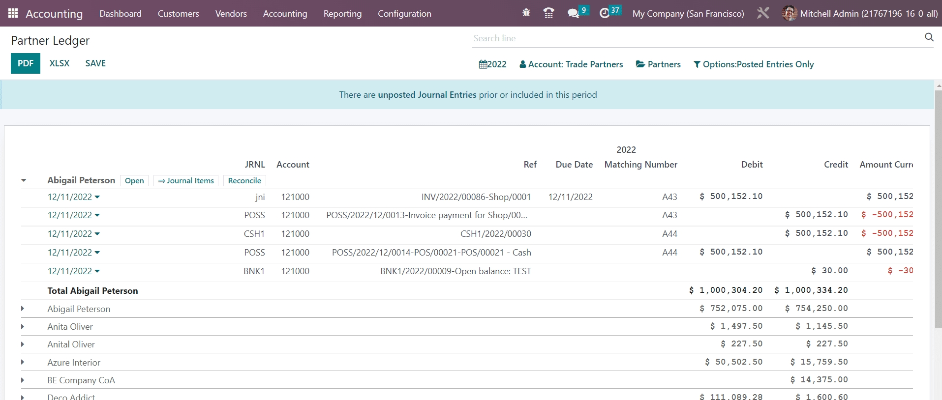 The report of receivable and payable journal entries of partners can be observed in the Partner Ledger reporting platform. It shows the Journal, Account, Reference, Due Date, Matching Number, Debit, Credit, Amount, Currency, Balance of the partners during the select period of time. In order to reconcile the accounts of the partners, you can use the Reconcile button given on the report.