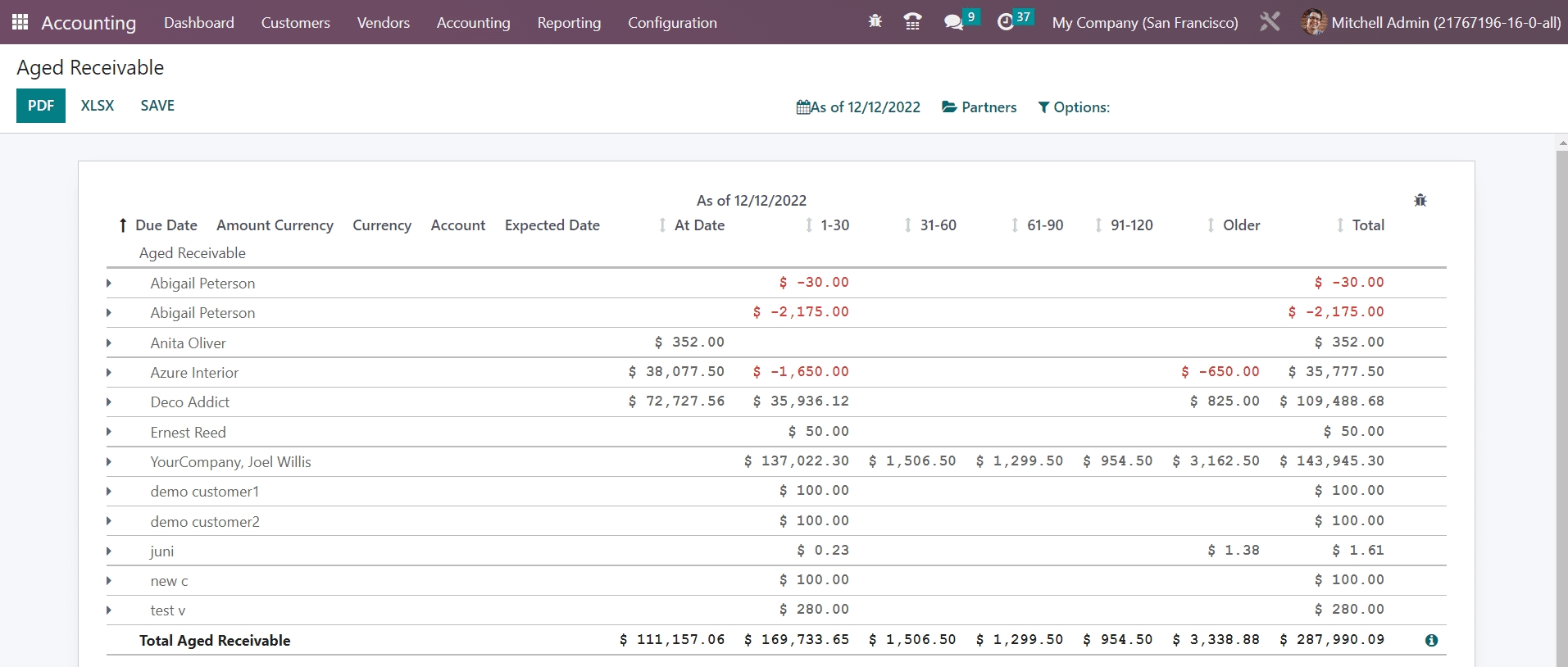 The Aged Receivable platform in the Reporting menu assists you to get reports of the aged partner receivable balances of the selected date. These are the reports of invoices that are awaiting payment. If the customer failed to pay the invoice even after the days mentioned in the payment terms, the payment will fall under the category of Aged Receivables. As shown in the screenshot below the report shows the Due Date, Amount, Currency, Account, Expected Date, receivable amount At Date, Older, and Total.