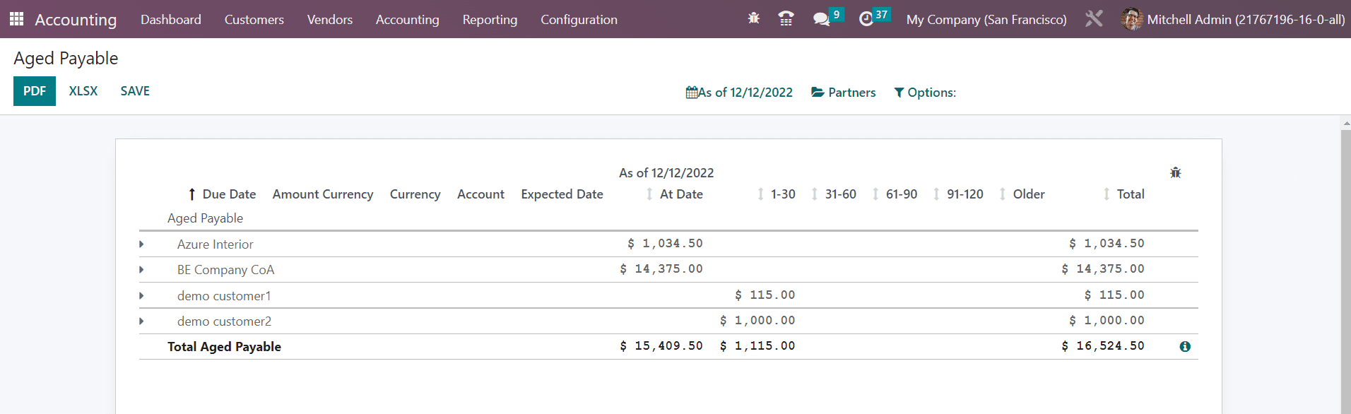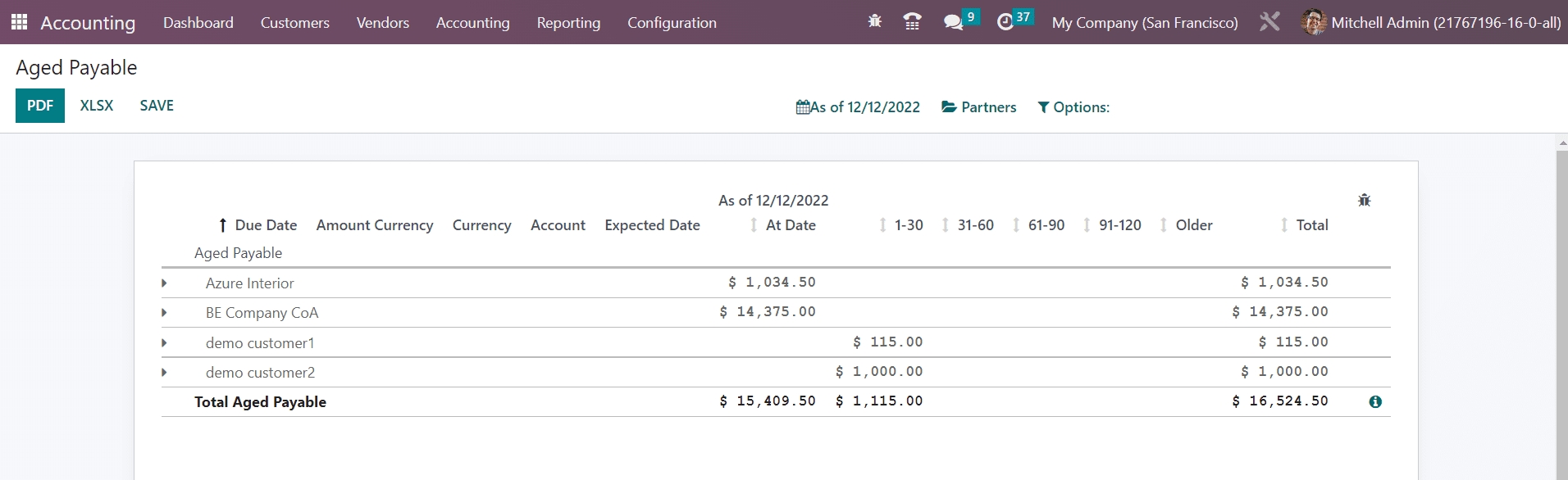 Similar to the Aged Receivable platform the Aged Payable also shows delayed payment reports. These delayed payments are meant to be paid by your company to the respective partners before the due date. If your company failed to pay the invoices before the due date mentioned in the payment terms, it will be added to the Aged Payable report in the Odoo Accounting.