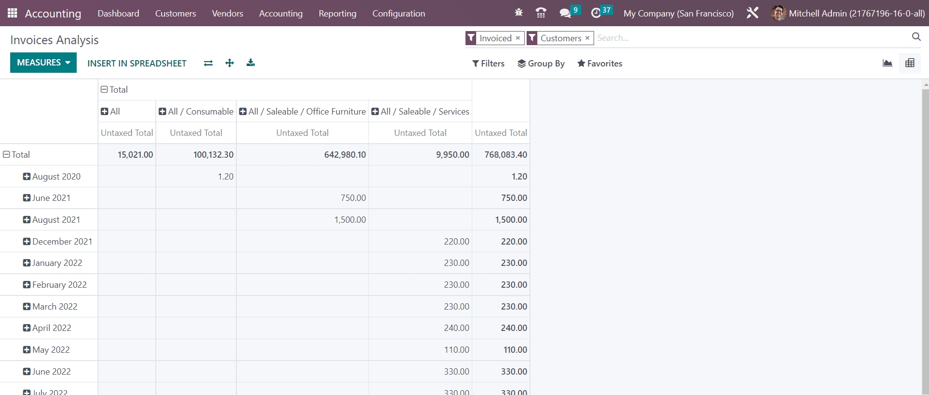 Using the Invoice Analysis option from the Reporting menu, you can observe the invoice reports of the company during the selected accounting period. The report can be generated in the graphical and pivot table format at your convenience. You will get the Average Price, Product Quantity, Total, Untaxed Total, and Count as Measures on this window. The available default filters are My Invoice, To Invoice, Invoiced, Customer, Vendor, Invoices, Credit Notes, Invoice Date, and Due Date. The customization option will help you to create custom filters for invoice analysis.