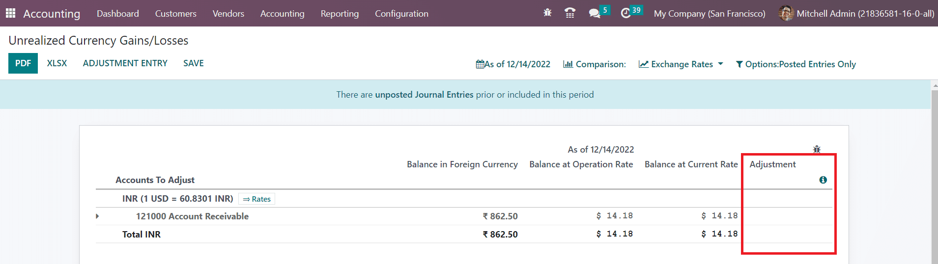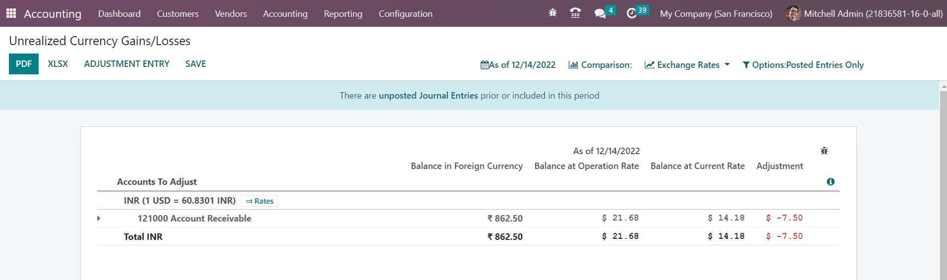 You will get the report of all open accounts on your balance sheet that need to be re-evaluated again in the Unrealized Currency Gains/Losses platform in the Reporting menu. The reports will be grouped based on the currency used in the respective account. It shows the details of the Balance in Foreign Currency, Balance at Operation Rate, Balance at Current Rate, and Adjustment. Required adjustments can be made to the entries using the Adjustment Entry button.
