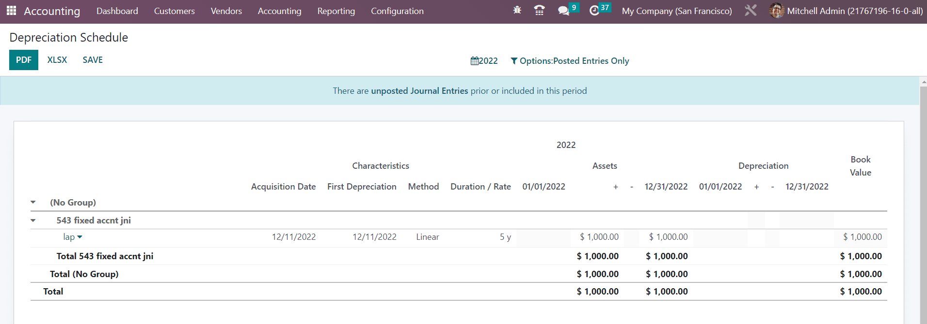 The schedule created for depreciating the cost of valuable assets over a particular number of accounting periods can be observed in the Depreciation Schedule platform. As shown in the image below, the report shows the Acquisition Date, First Depreciation, Method, Duration/Rate, depreciation dates, and Book Value.