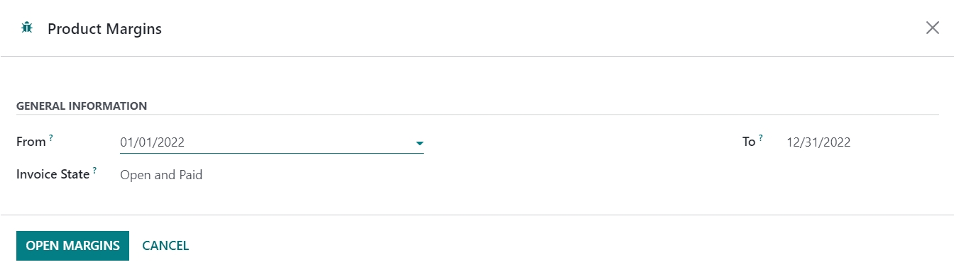 In order to calculate margins on products, you can click on the Product Margins option from the Reporting menu. A pop-up will appear as shown below to mention the From date and the Invoice State. The invoice state can be set as Paid, Open and Paid, or Draft, Open and Paid.