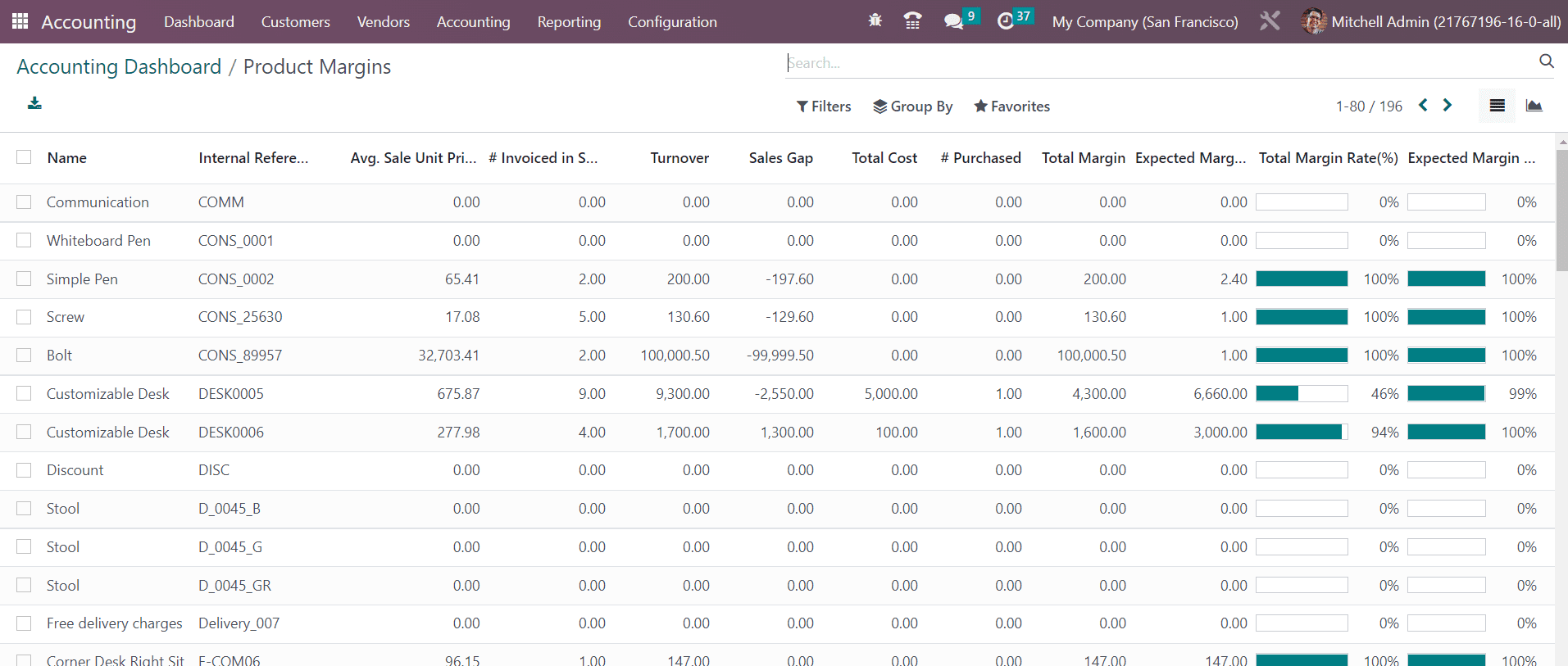 The report shows the Name of the product, Internal Reference, Average Sale Unit Price (Average price in customer invoices), Invoiced in Sale (Sum of quantity in customer invoices), Turnover (Sum of multiplication of invoice price and quantity of customer invoices), Sale Gap (Expected sale- turnover), Total Cost (Sum of multiplication of invoice price and quantity of vendor bills), Purchased (Sum of quantity in vendor bills), Total Margin (Turnover- standard price), Expected Margin, Total Margin Rate, and Expected Margin Rate.